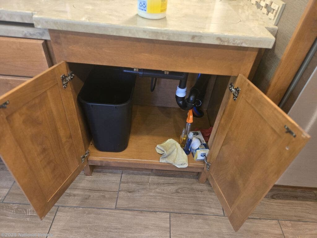 With two slide-outs, a bath and a half, and a residential-style interior, this Class A motorhome provides unmatched livability. The front living area features an entertainment center, with an electric fireplace, theater seating, and a convertible dinette, while the well-equipped kitchen includes solid surface countertops, a large refrigerator, convection microwave, and generous storage.