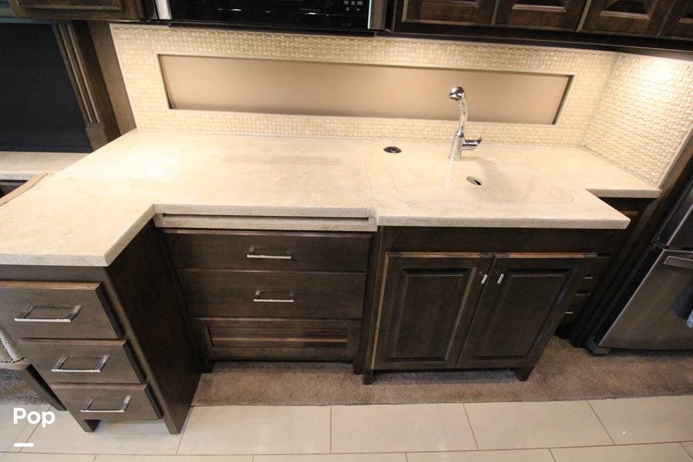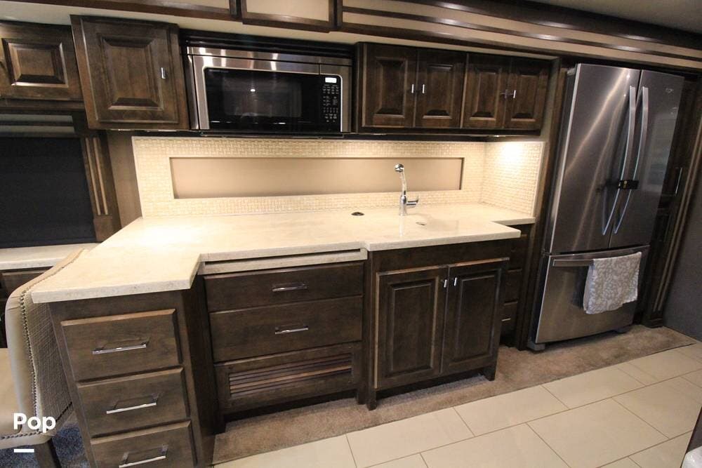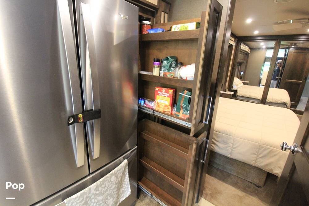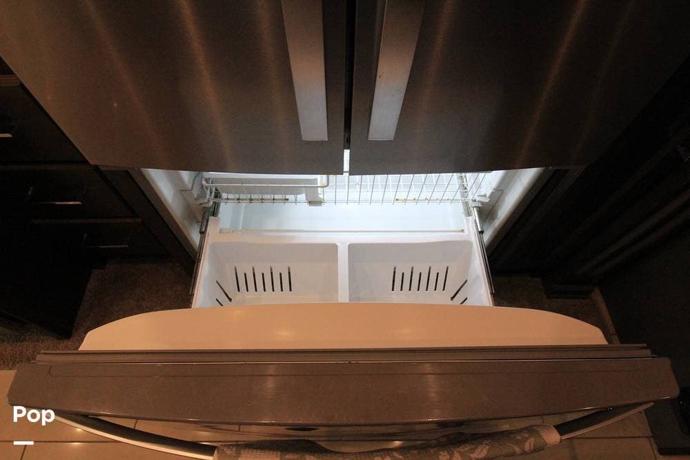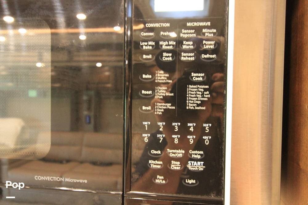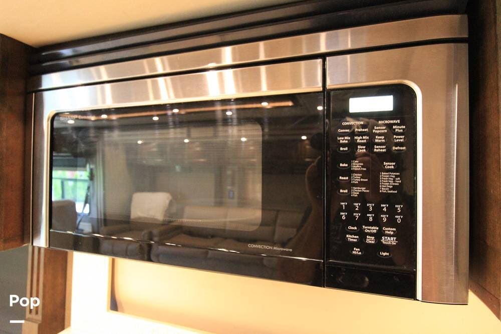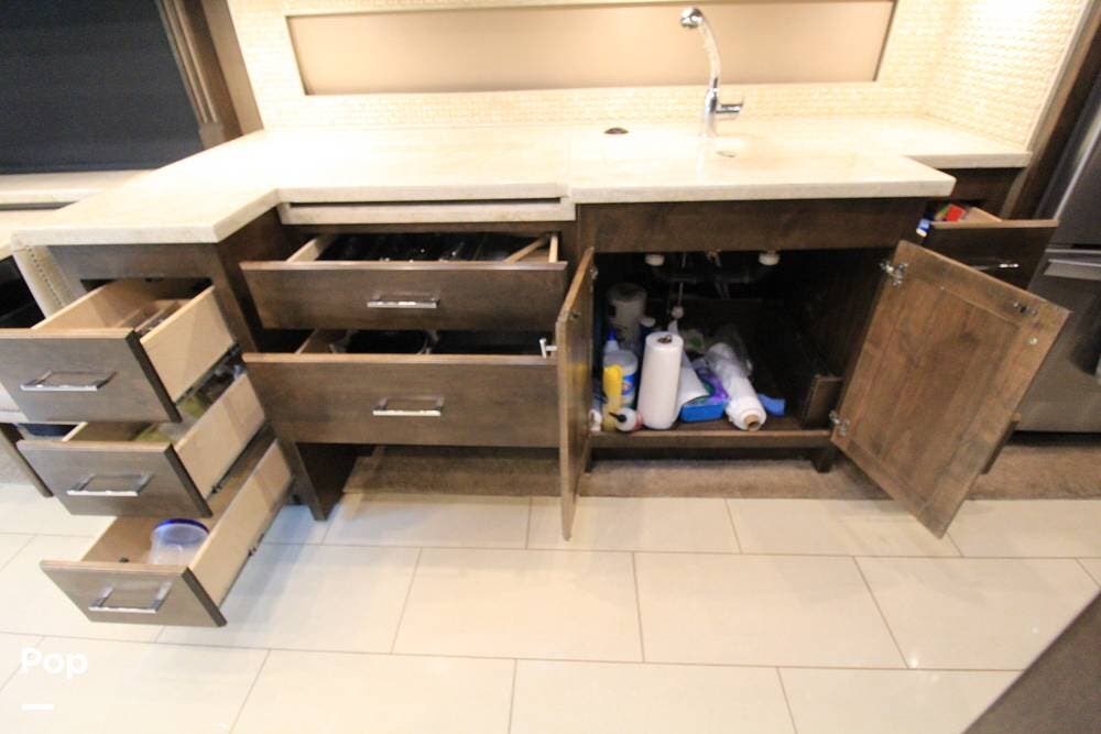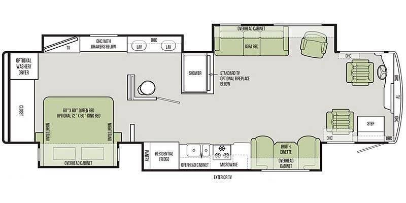 The four slides create an open front living space with the full bath and main bedroom to the rear of the coach. The kitchen is located on the entry side and is fully equipped, featuring a residential refrigerator/freezer with a built-in ice maker, a convection microwave, and a large pantry.