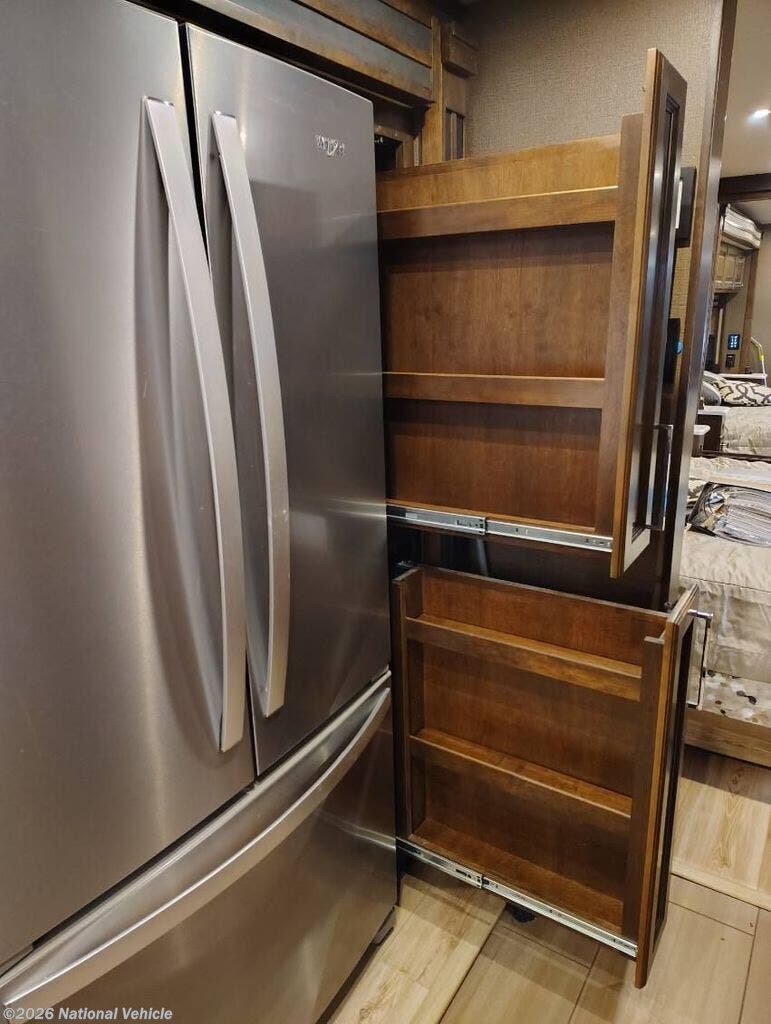 Step inside to a spacious, well-appointed interior where comfort meets style. The expansive living area features plush seating, a large dinette, and panoramic windows that flood the space with natural light - perfect for entertaining or relaxing after a day of adventure. The fully equipped kitchen boasts high-quality appliances, abundant counter space, and generous storage, making meal prep effortless anywhere your travels take you.