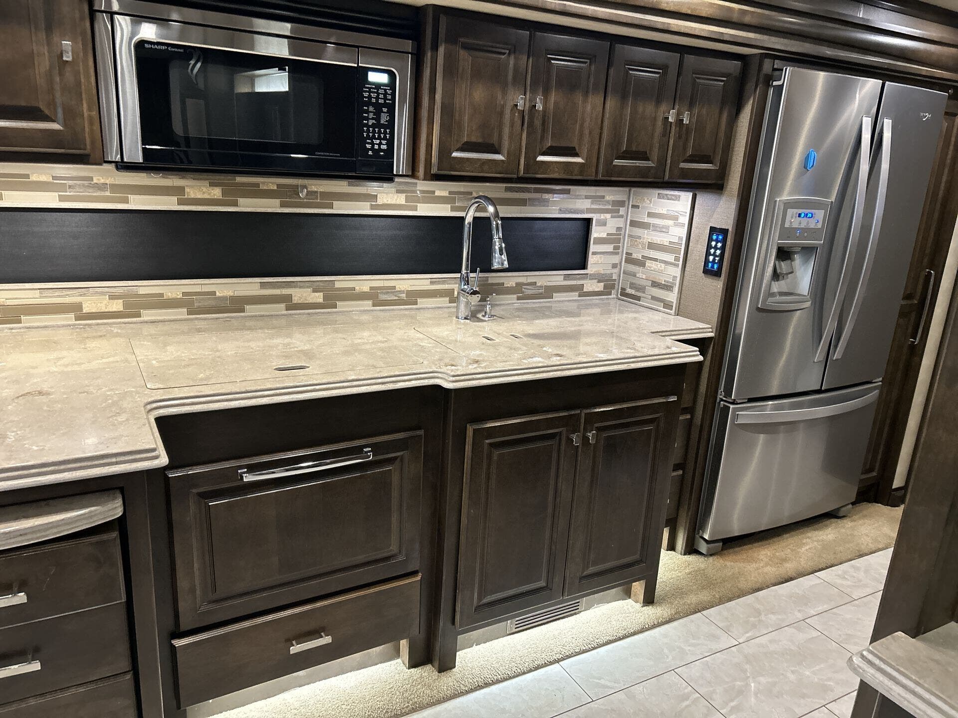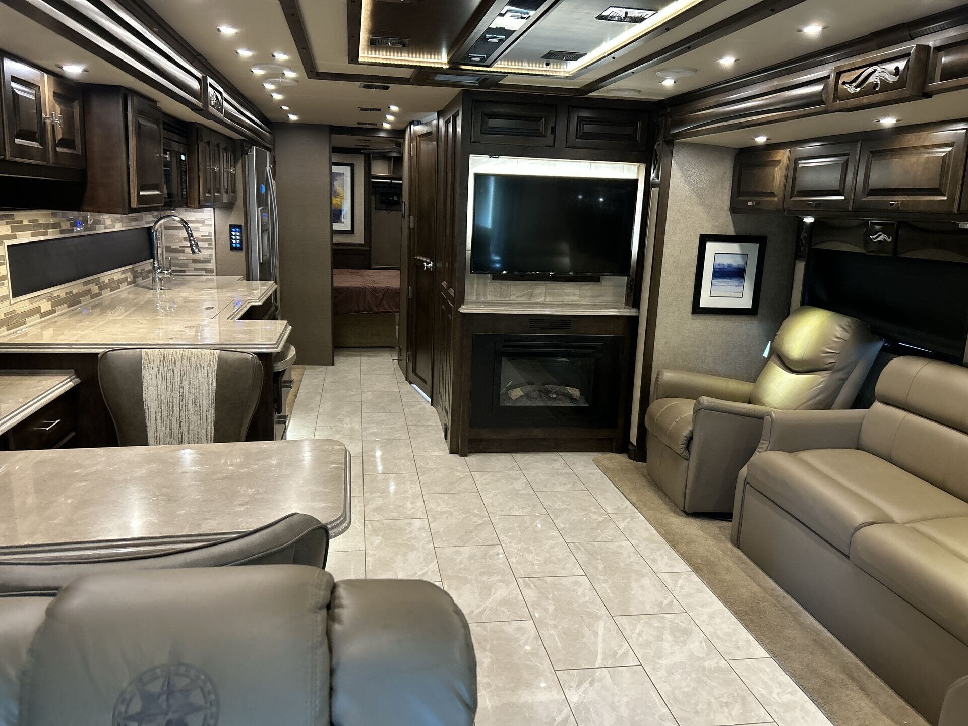 The 40AH layout maximizes comfort with a Front Living Area and Front Entertainment setup, followed by a Mid Kitchen and Mid Bath, culminating in a Rear Bedroom. Four slideouts expand interior living space, creating an open, airy feel perfect for entertaining or relaxing after a day on the road. The interior amenities include a King Size Bed for restful nights, a Sofa Bed for additional guests, and solid surface countertops that blend style with durability. A Fireplace adds warmth and ambiance, while Day/Night Shades provide privacy and light control in any environment.