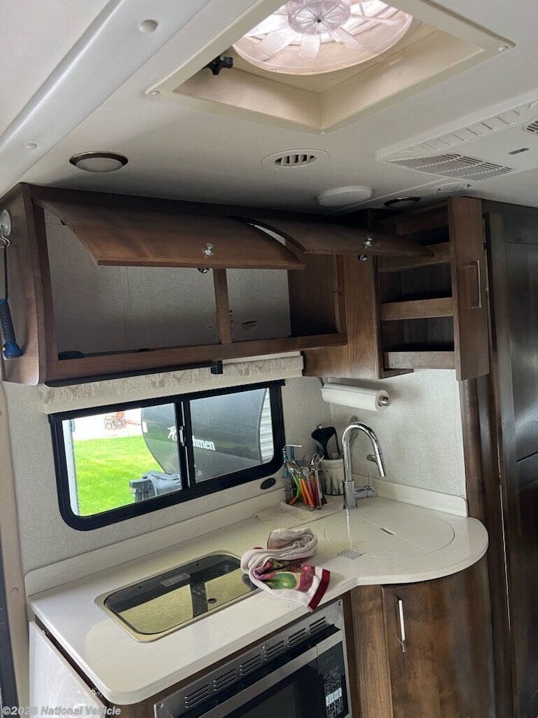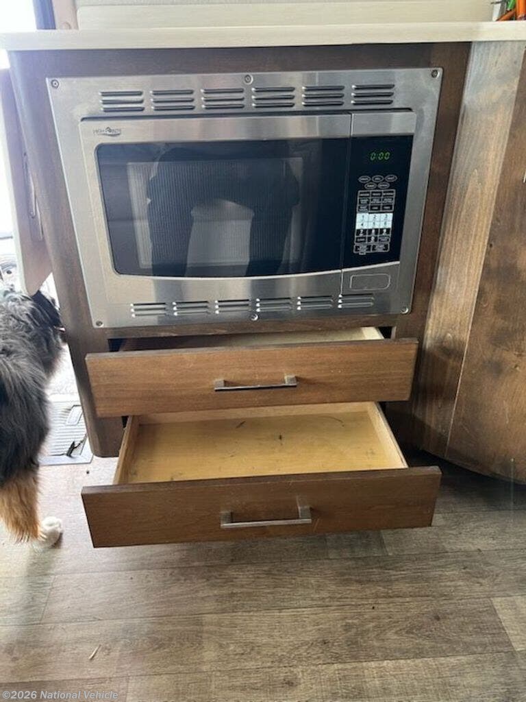 The smartly designed floorplan includes a spacious rear bedroom with a slide-out for extra room, a walk-around queen bed, and ample wardrobe storage. The main living area features a dinette and entertainment center, while the fully equipped kitchen offers solid-surface countertops, a convection microwave, two-burner cooktop, refrigerator, and stainless-steel sink?perfect for preparing meals on the road.