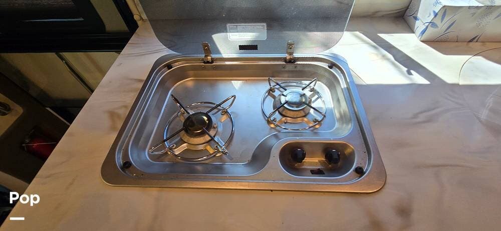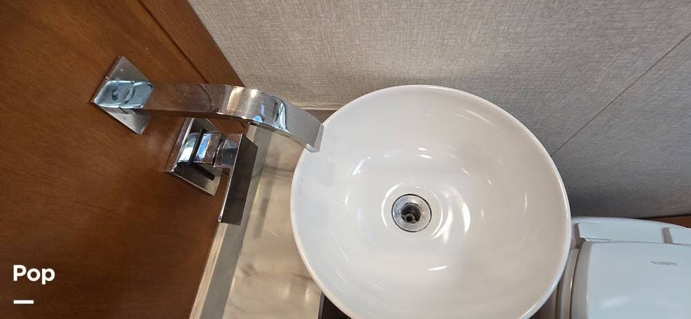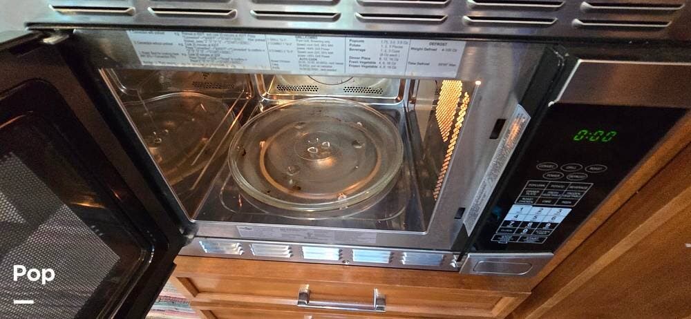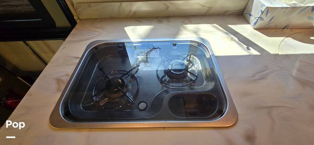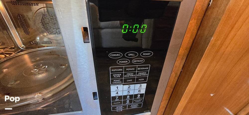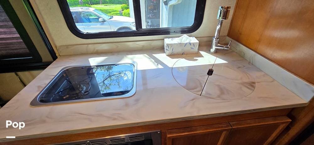 The kitchen is equipped for real cooking, featuring a two-burner LP cooktop with a flush glass cover, a Stainless High Point convection microwave, and 6.5 cu. ft. Norcold Dual power refrigerator, deep stainless steel sink, designer faucet, and stylish cabinetry with soft-close drawers and a built-in spice rack.