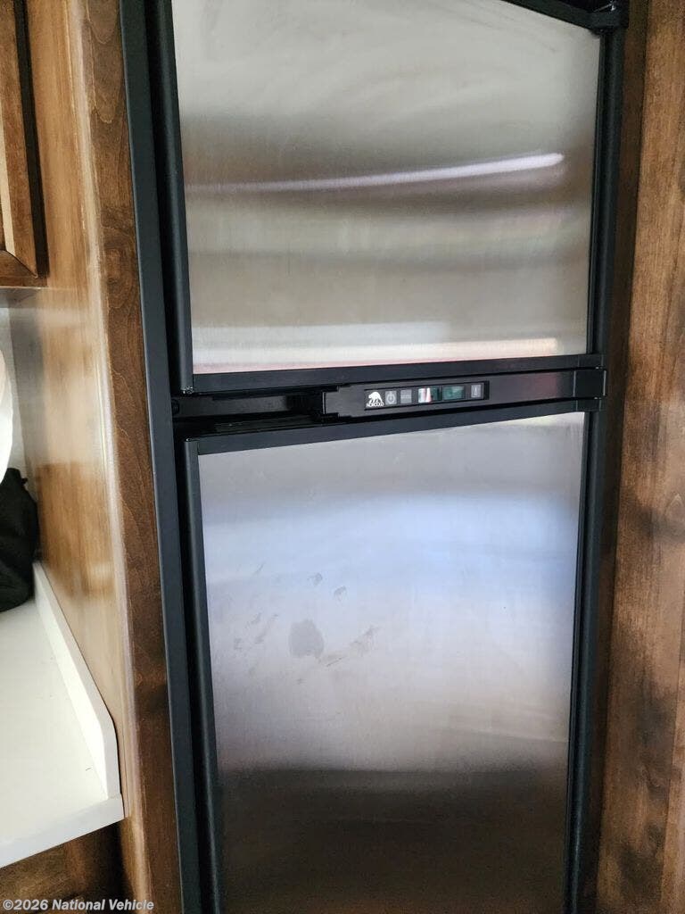 The kitchen is well-equipped with solid surface countertops, a convection microwave, refrigerator, and generous storage, making it easy to prepare meals wherever your travels take you. Across from the kitchen, the living and dining area offers a comfortable space to relax or entertain.