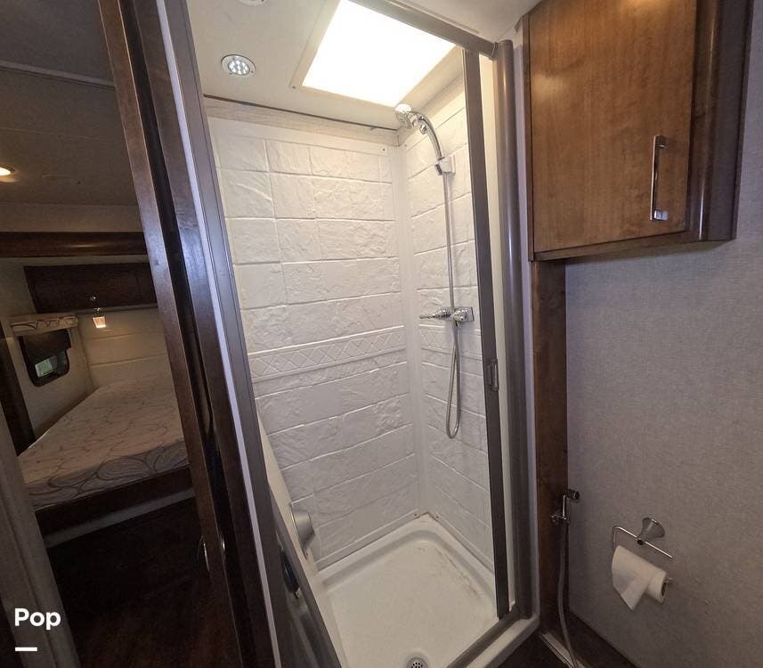 Inside, find comfort in a mid-sized fridge, 2-burner cooktop, and convection microwave. The private bathroom offers a sink, toilet, and shower.