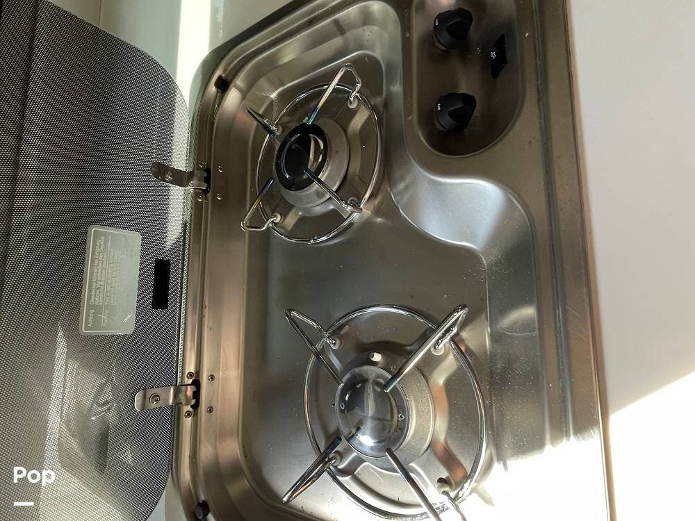 The full kitchen has a 2-burner stovetop with a cover, a convection microwave, a deep sink, a fridge/freezer, a slide-out pantry, and a spice rack.