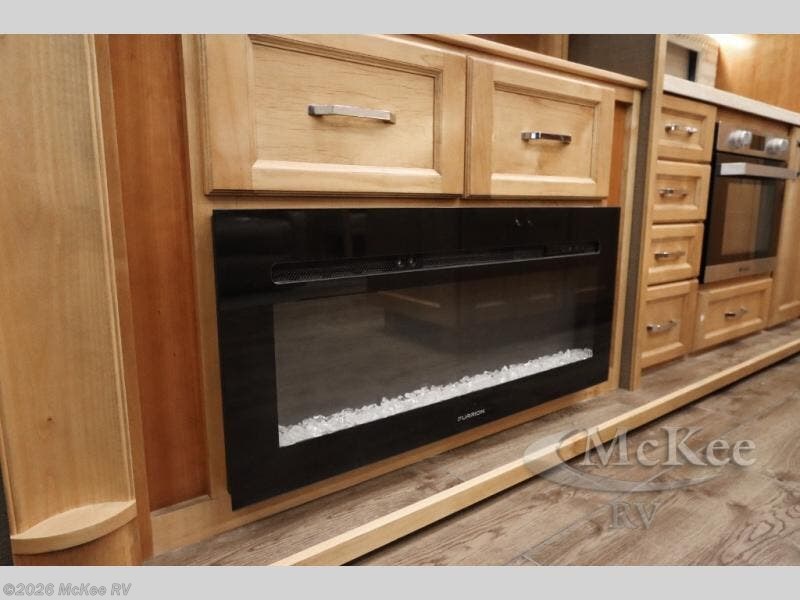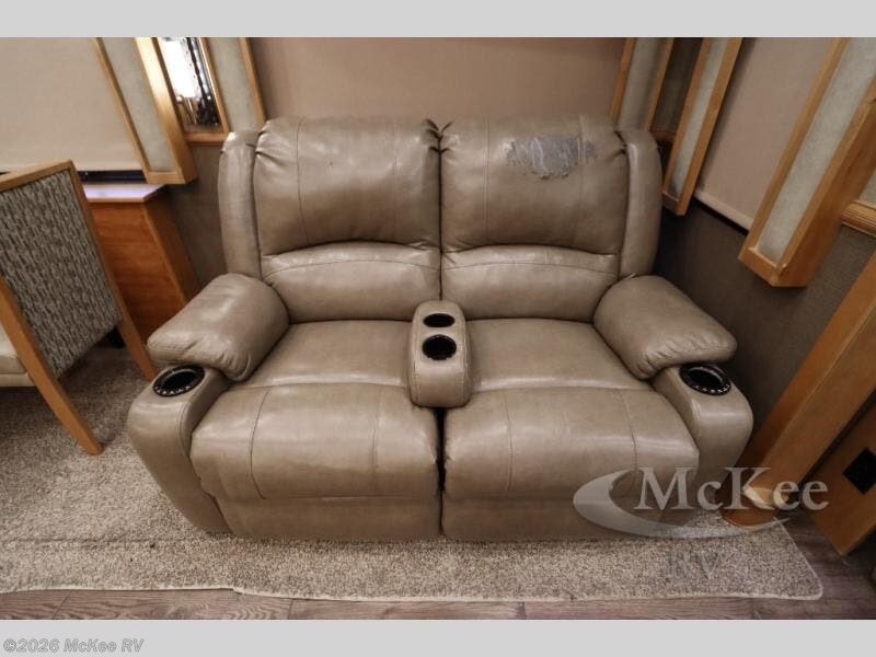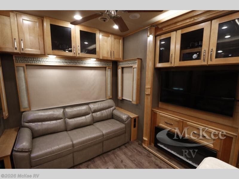 When you choose to camp out with this four-slide Beacon fifth wheel, you are choosing comfort and style! With conveniences such as an island with overhead lights and a large walk-in closet, your camping experience will be easier than ever before. The living area features a 60" theater sofa with cup holders, an 80" sofa bed, and a 50" LED TV on top of a 40" fireplace. For complete privacy, you can rest each evening on the king bed slide in the master suite and wake up to shower in your very own full bathroom that includes a sliding pocket door and a double-sink vanity.