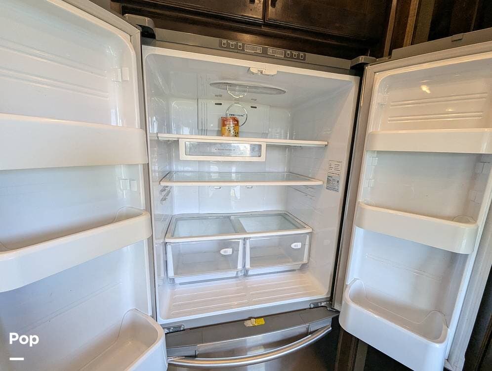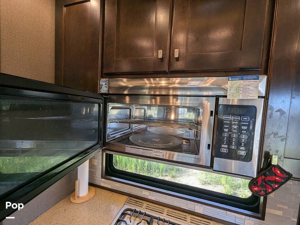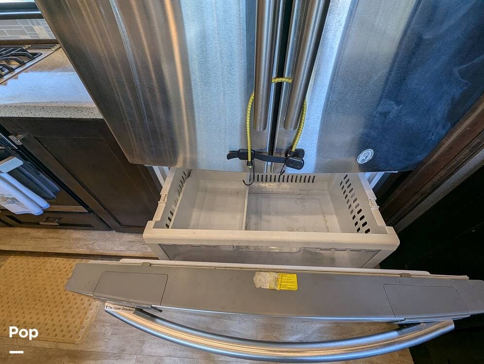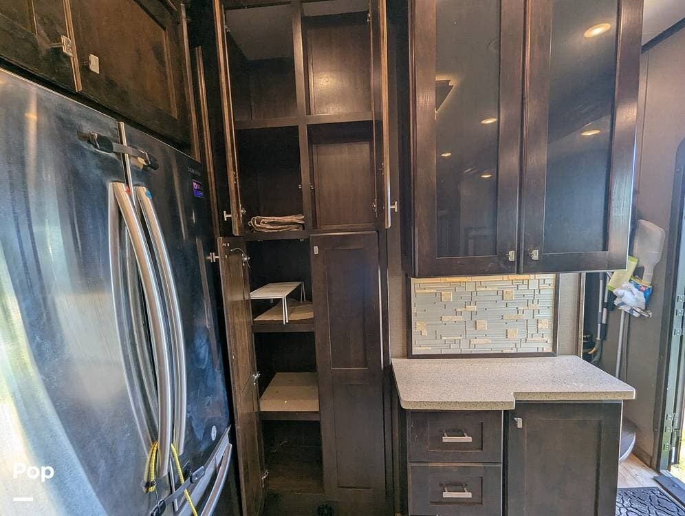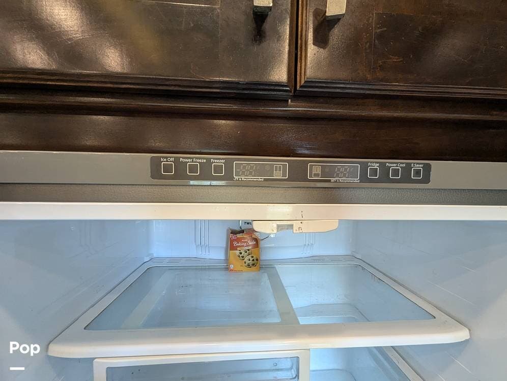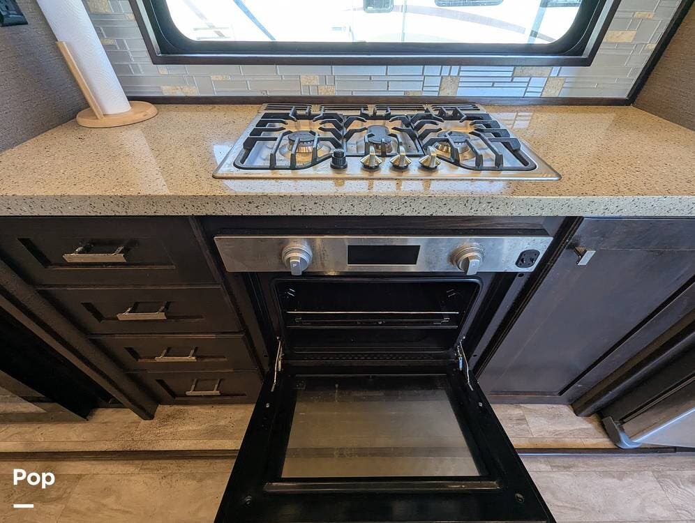 The galley is on a slide and has a 3-burner gas stove and oven, a convection, a residential refrigerator with an ice maker, a pantry storage closet, and a nice island.