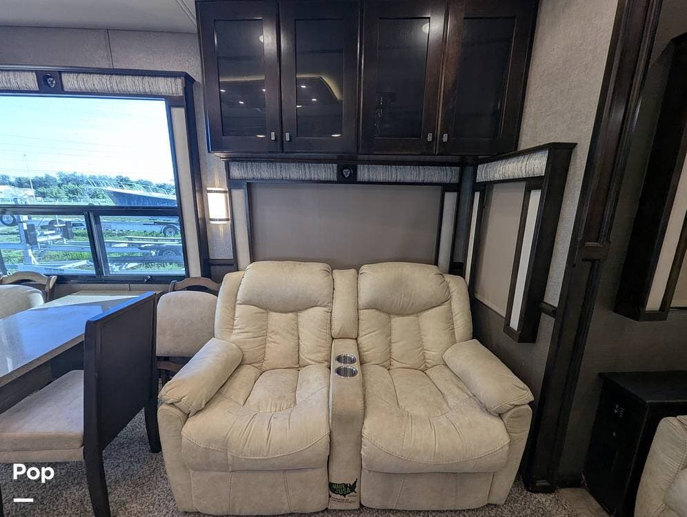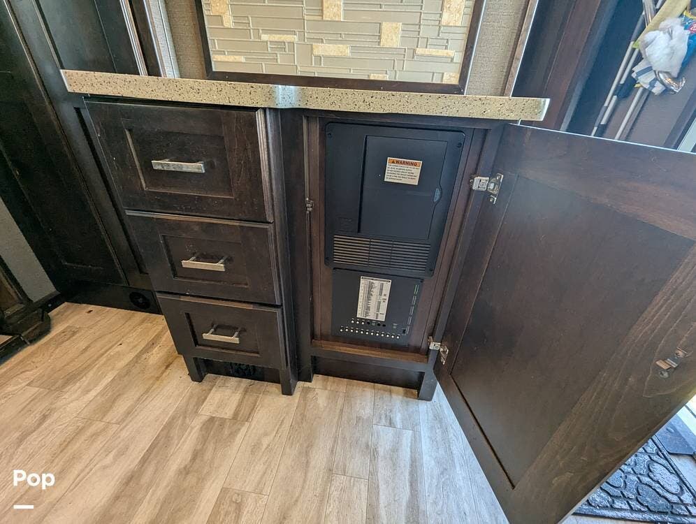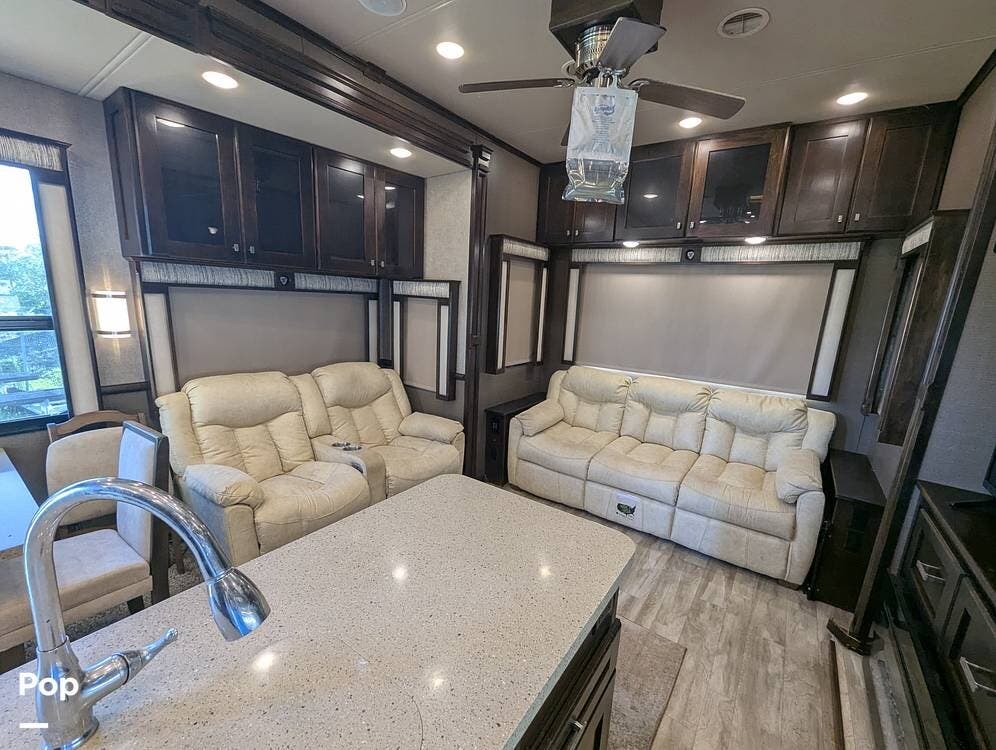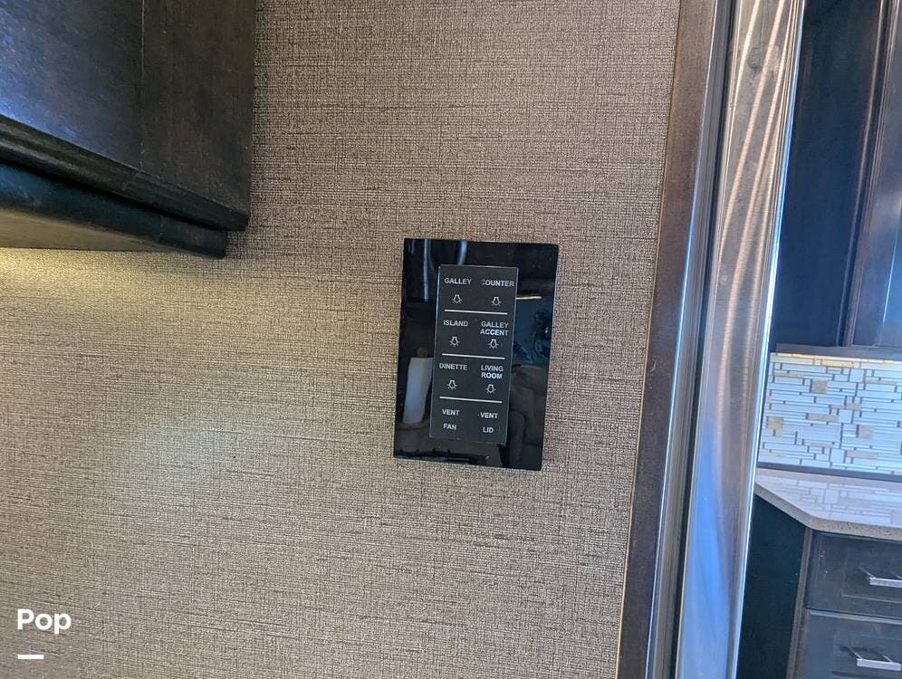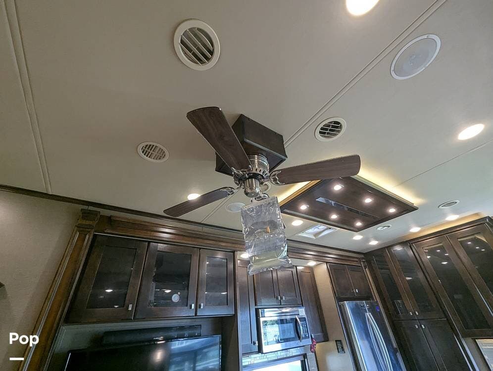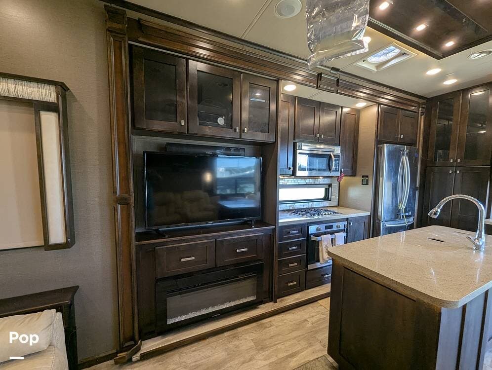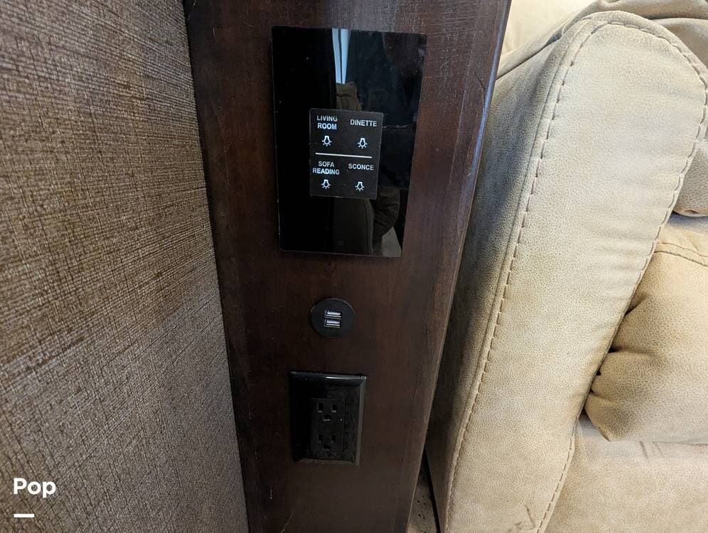 The living area has a comfortable sofa that converts to extra sleeping space, an overhead ceiling fan, and a stadium recliner adjacent to the TV and fireplace. There are touch panels throughout for lighting control. A whole-house vacuum is convenient with a crumb sweeper port!