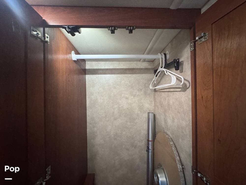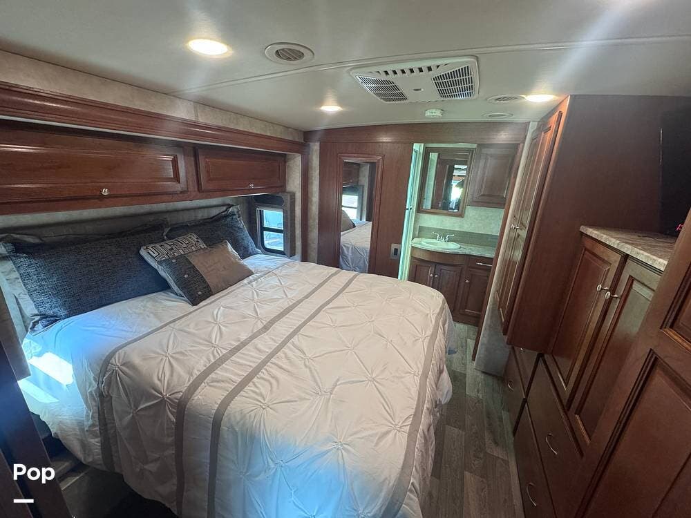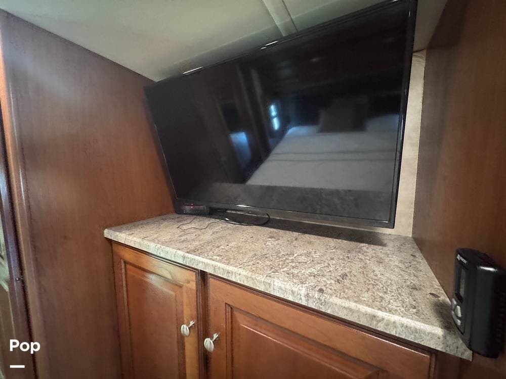 In the rear of the coach, the bedroom offers a comfortable retreat with a new queen mattress installed for restful nights. There's generous closet space, overhead cabinets, and bedside nightstands, as well as a dedicated television for private entertainment. The layout is ideal for couples or solo travelers who want all the comforts of home on the road.