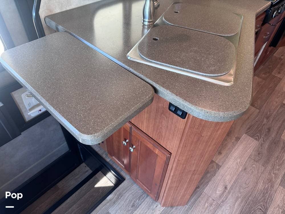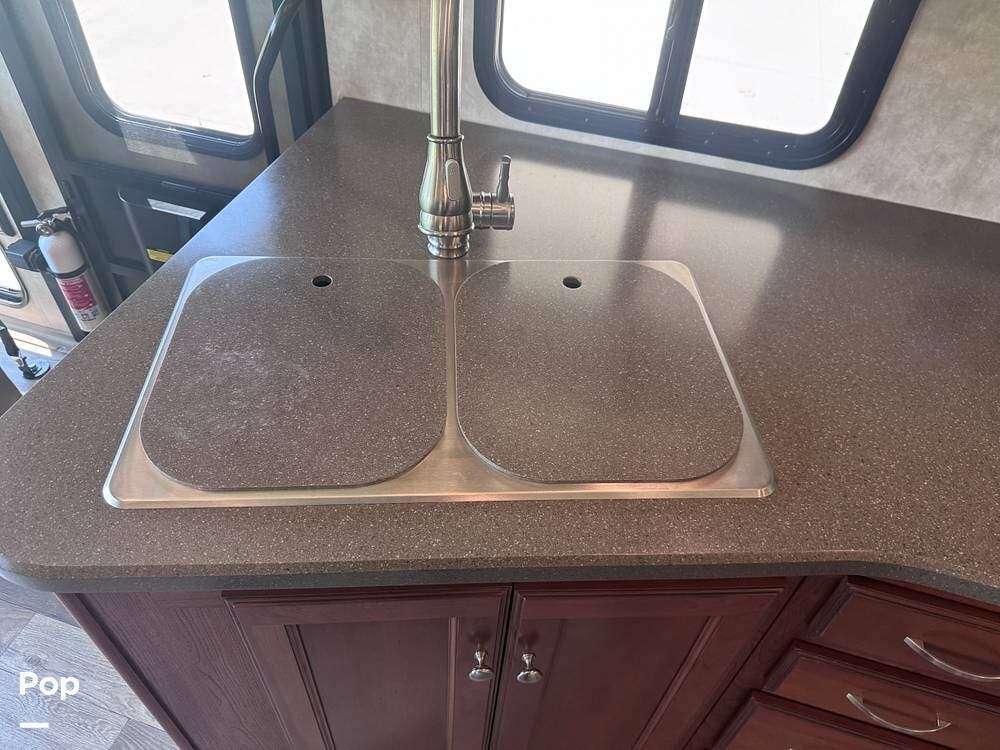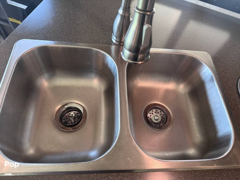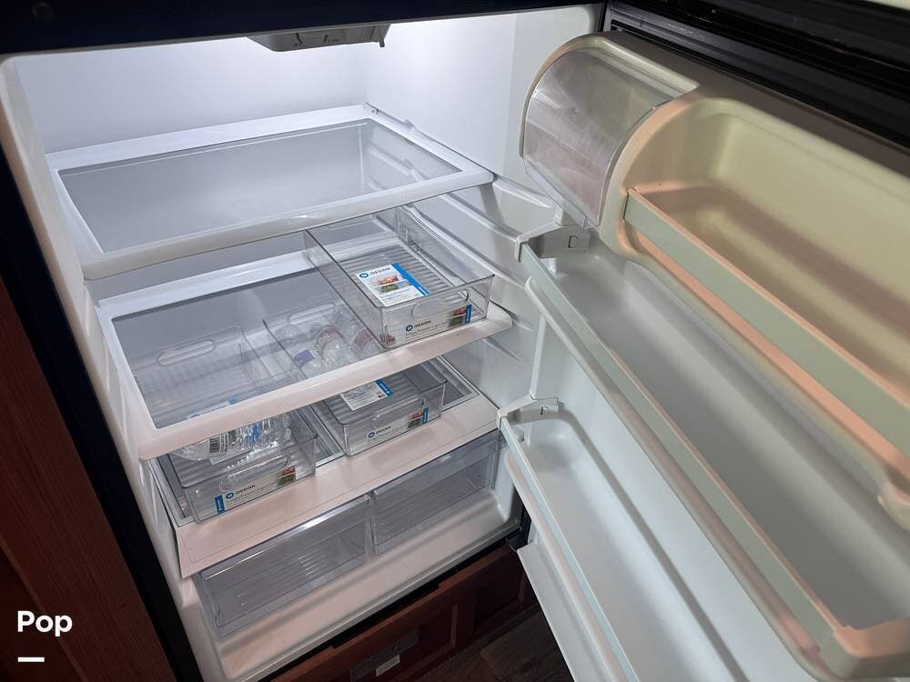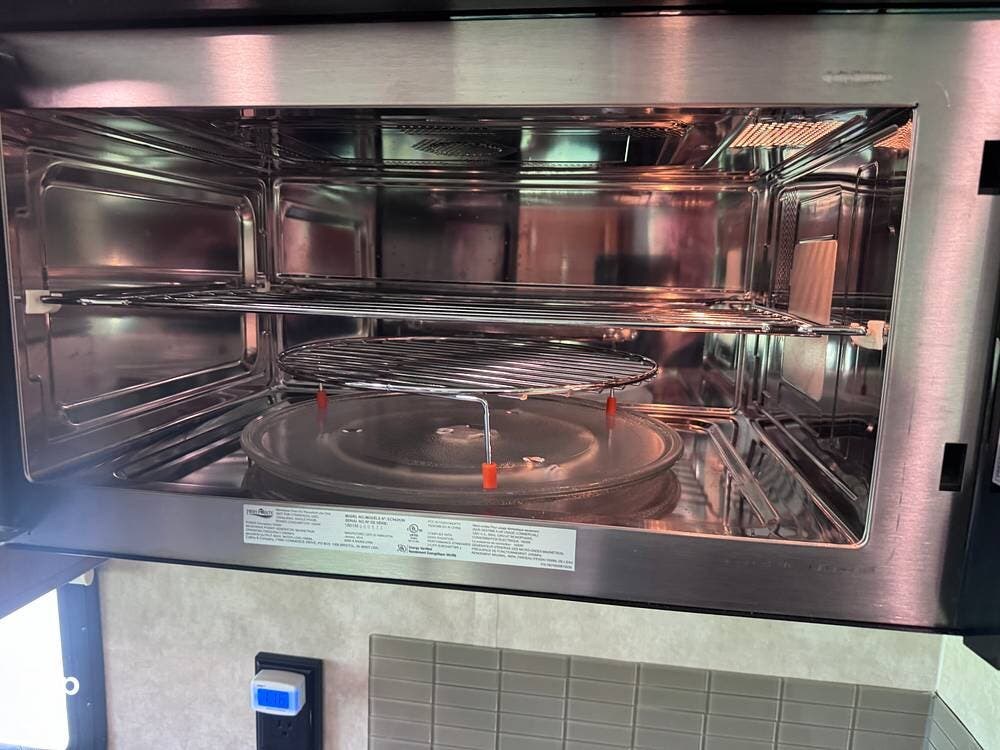 The kitchen features solid-surface countertops and ample cabinetry, and in July 2025, a new household-style refrigerator was installed, providing increased storage and quiet, energy-efficient operation. The space includes a three-burner cooktop, microwave, stainless steel sink, and a spacious pantry, making it easy to prepare meals while on the road, even if you haven't used it for cooking yet.