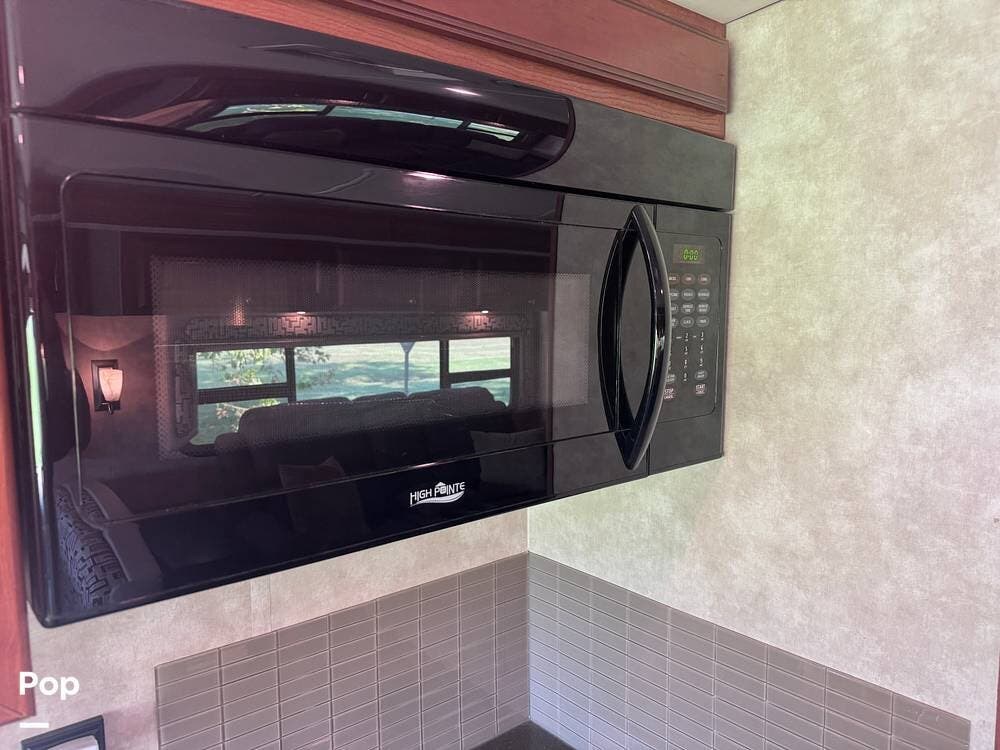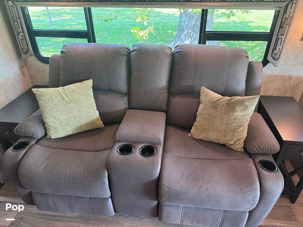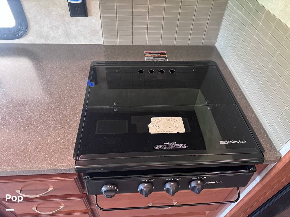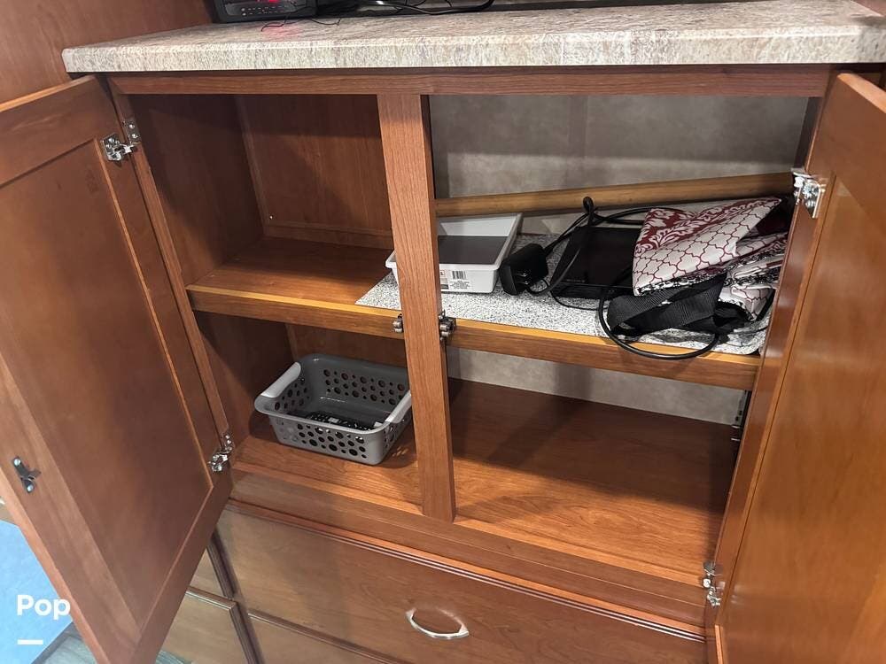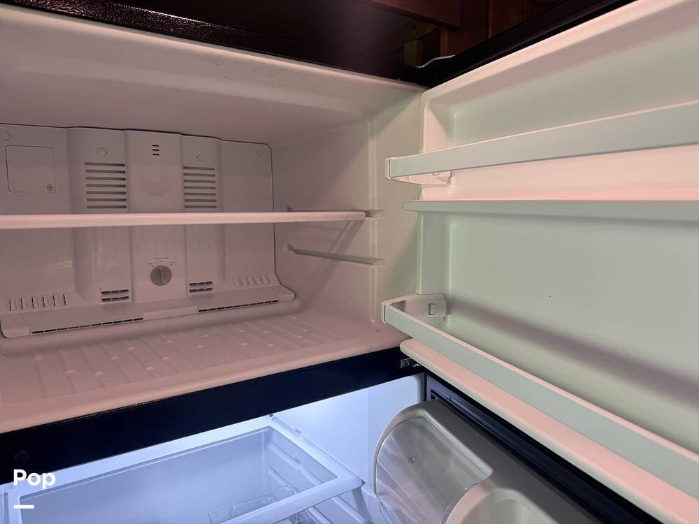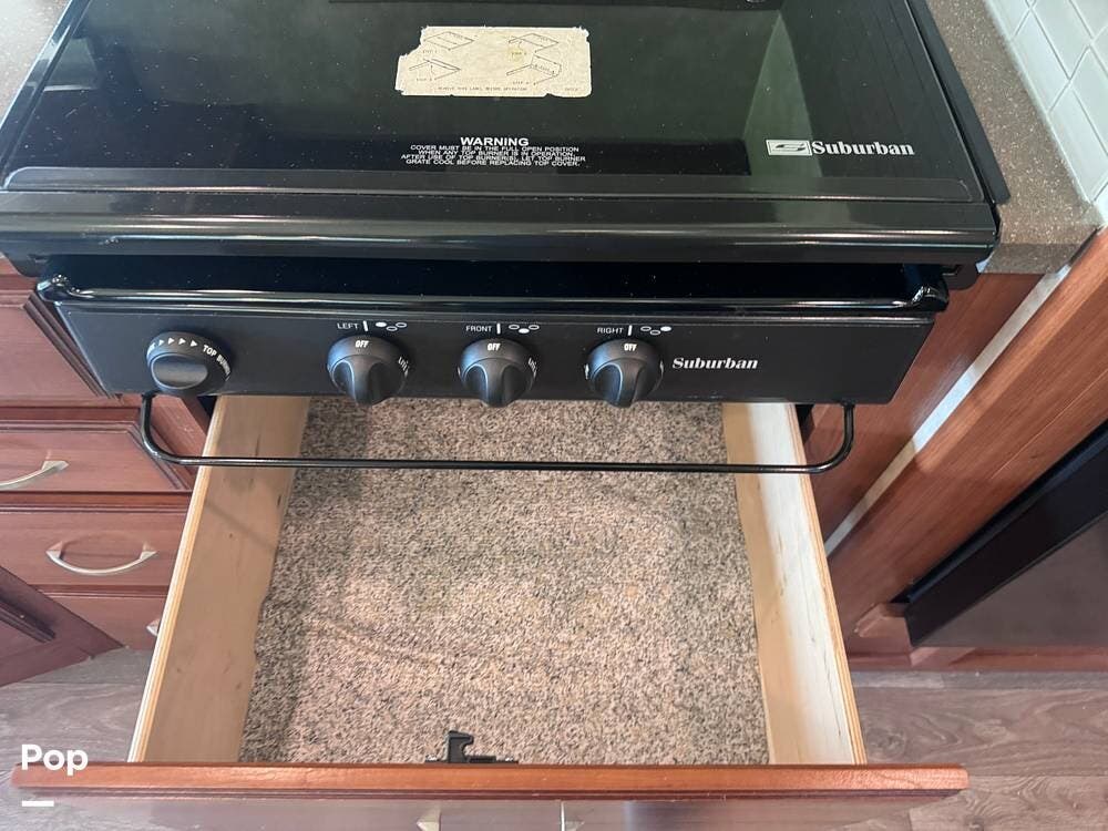 The kitchen features solid-surface countertops and ample cabinetry, and in July 2025, a new household-style refrigerator was installed, providing increased storage and quiet, energy-efficient operation. The space includes a three-burner cooktop, microwave, stainless steel sink, and a spacious pantry, making it easy to prepare meals while on the road, even if you haven't used it for cooking yet.