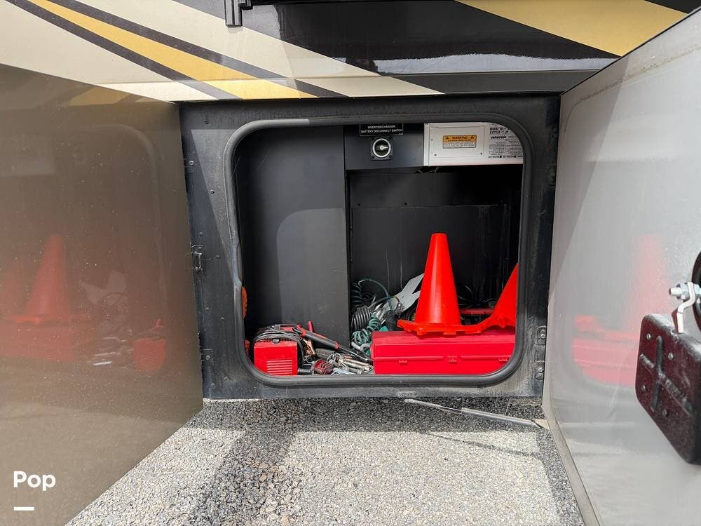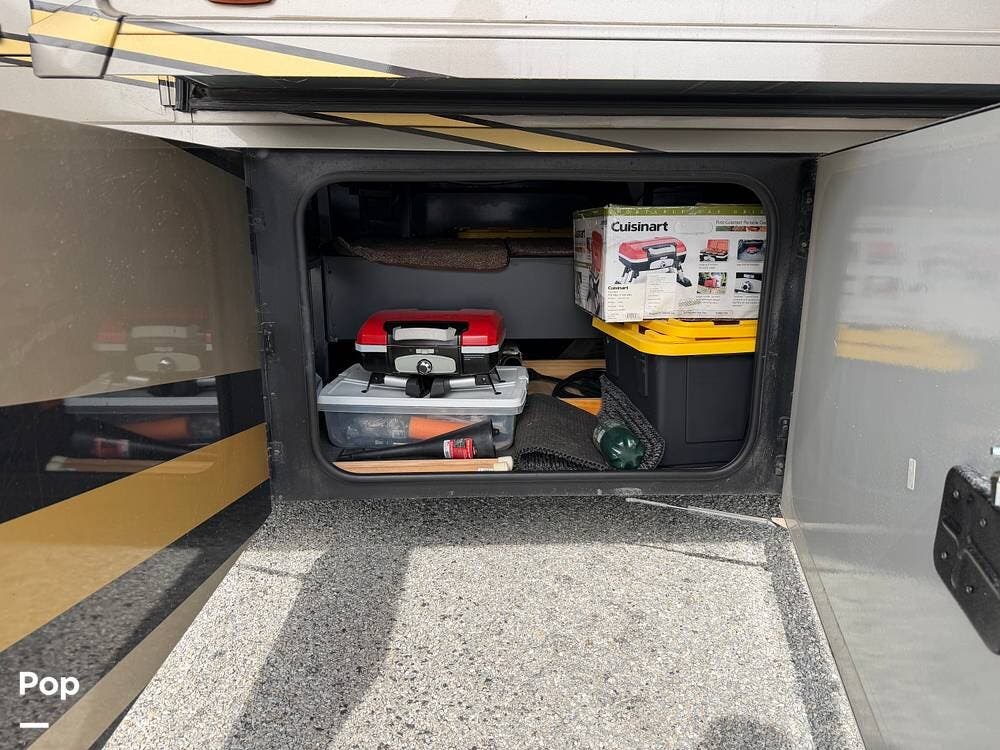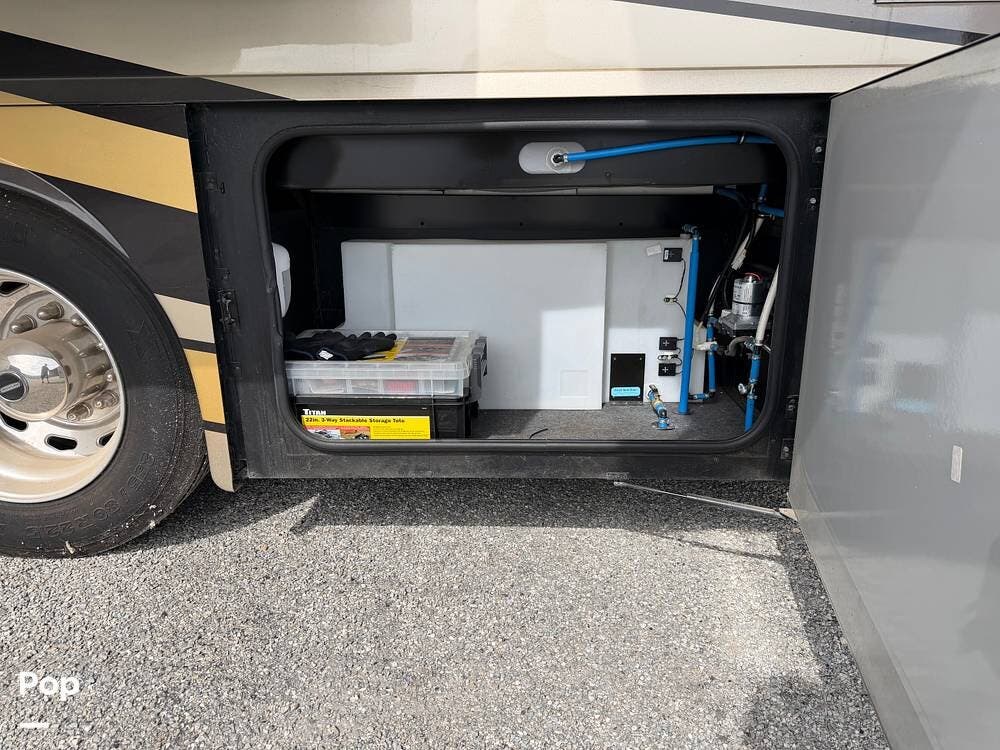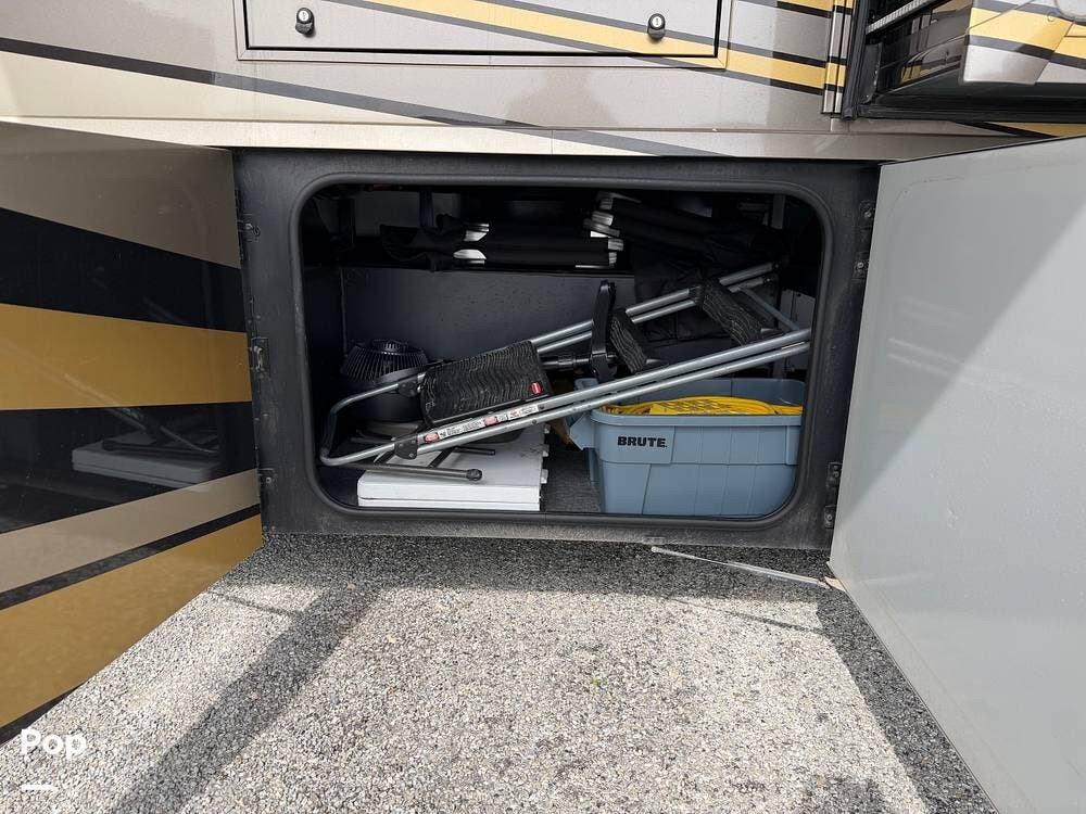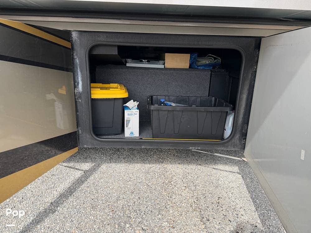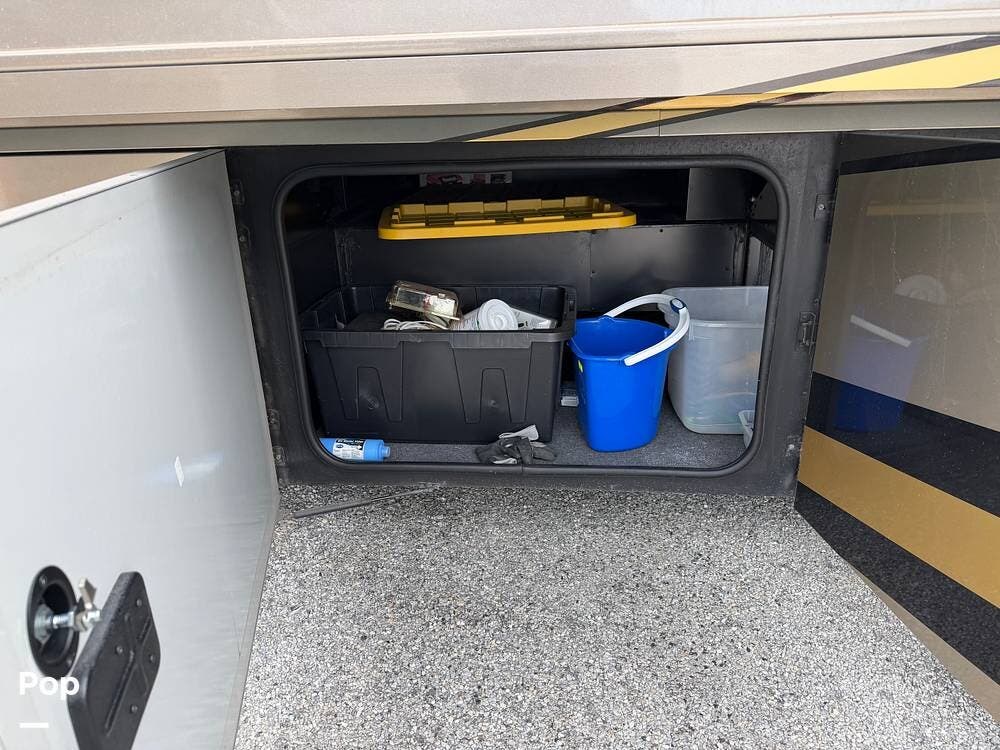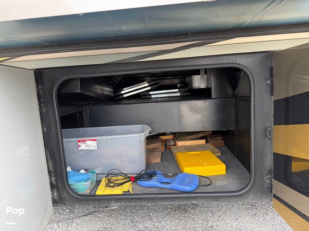 The exterior of this RV has plenty of storage compartments. Some are full pass-through.