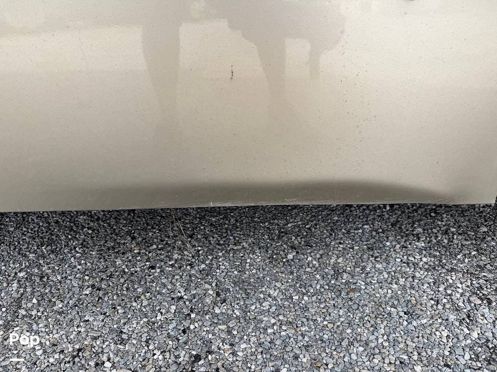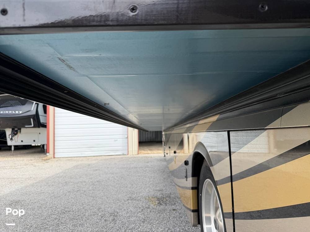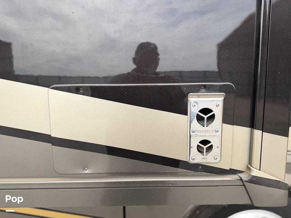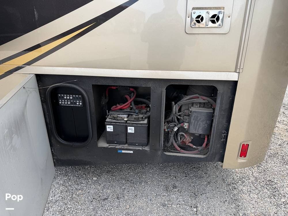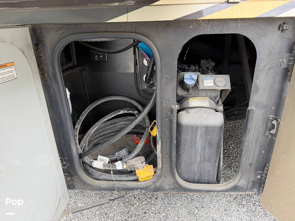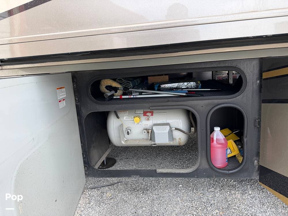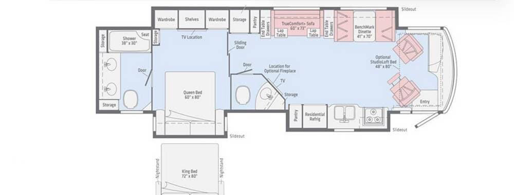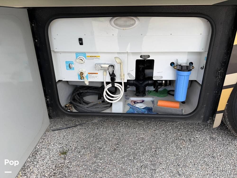 The exterior of this RV has plenty of storage compartments. Some are full pass-through.