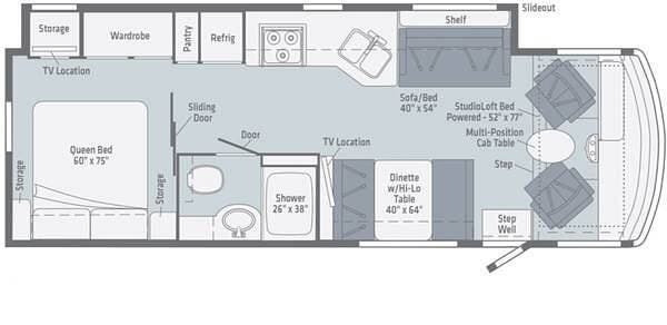 A full-wall slide opens up the living area, creating room to relax or gather. The front swivel seats add extra lounge space, while the overhead loft bunk provides versatile sleeping for guests or kids.