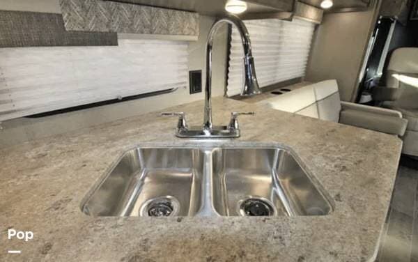 The galley is equipped with a residential-style refrigerator, microwave, cooktop, oven, and a double sink, all set into durable, solid-surface countertops.