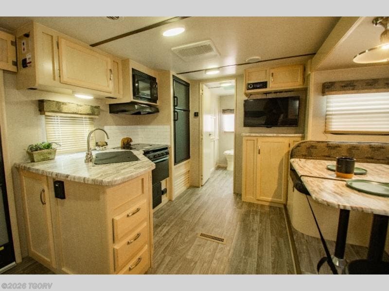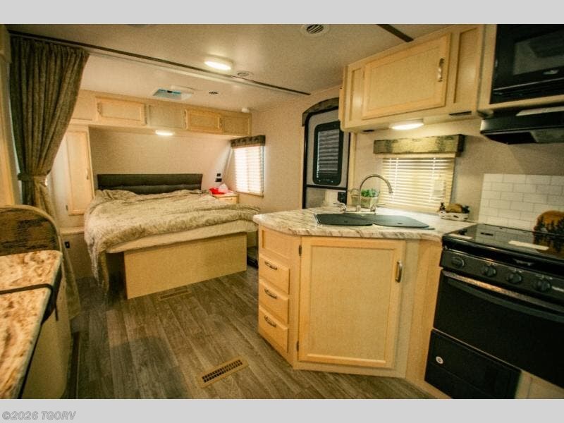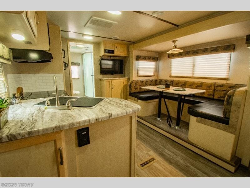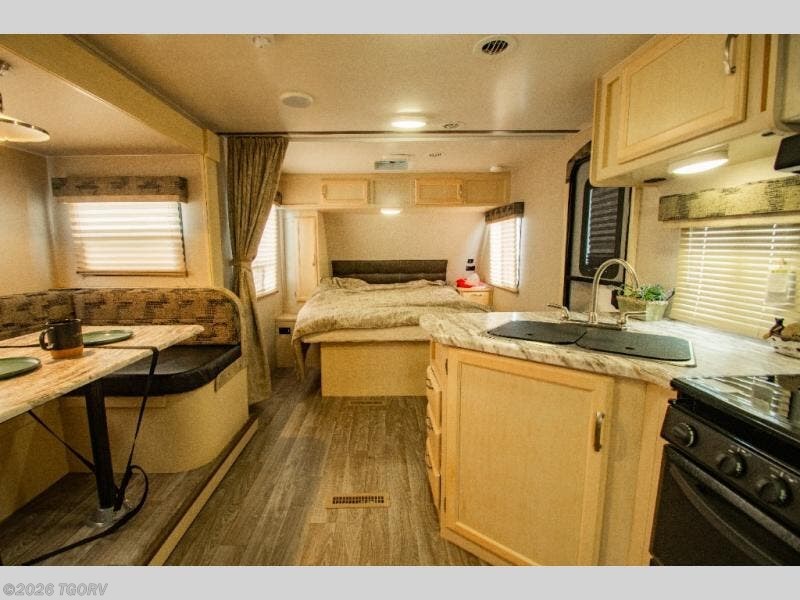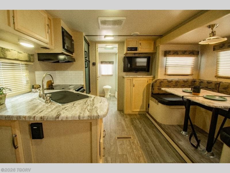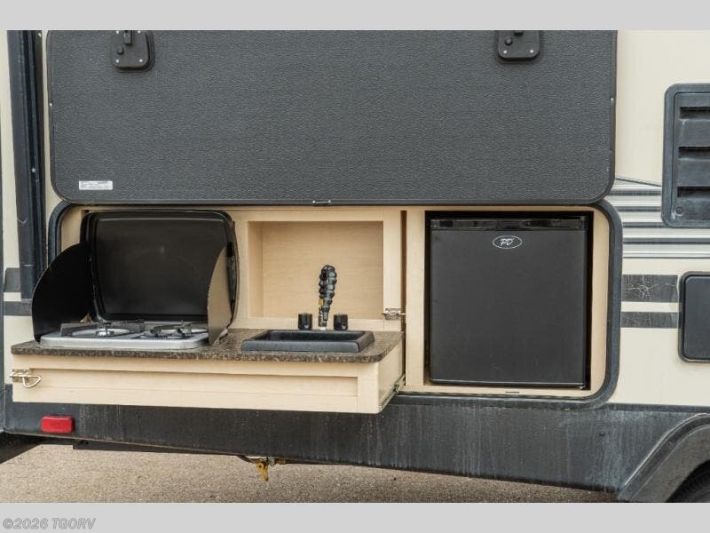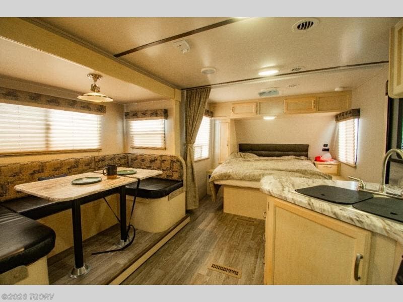 Camp comfortably for the weekend or more in this spacious, lightweight Minnie travel trailer. This model offers a spacious rear bath including a large wardrobe for your clothing. In fact, you will find abundant storage throughout the entire unit both inside and out. You can easily dine inside with added family or friends thanks to the U-shaped dinette slide out, and if you need extra sleeping space, the dinette easily folds down into a comfortable bed. The queen bed up front will also provide a great night's sleep. For a bit of privacy, there is a curtain that can be pulled to separate the queen bed from anyone who is sleeping on the dinette if you like, and to spend maximum time outdoors, you can choose to cook breakfast, lunch, and dinner outside during nice weather with the aid of an outdoor kitchen that includes a single sink, a two-burner cooktop, and refrigerator.