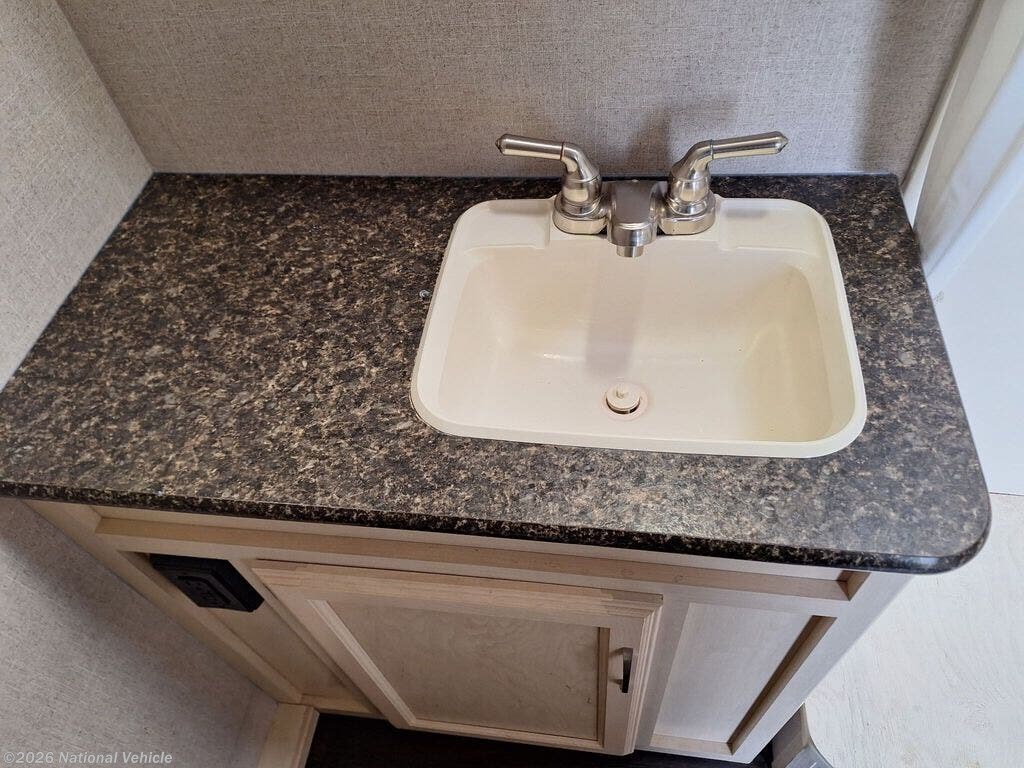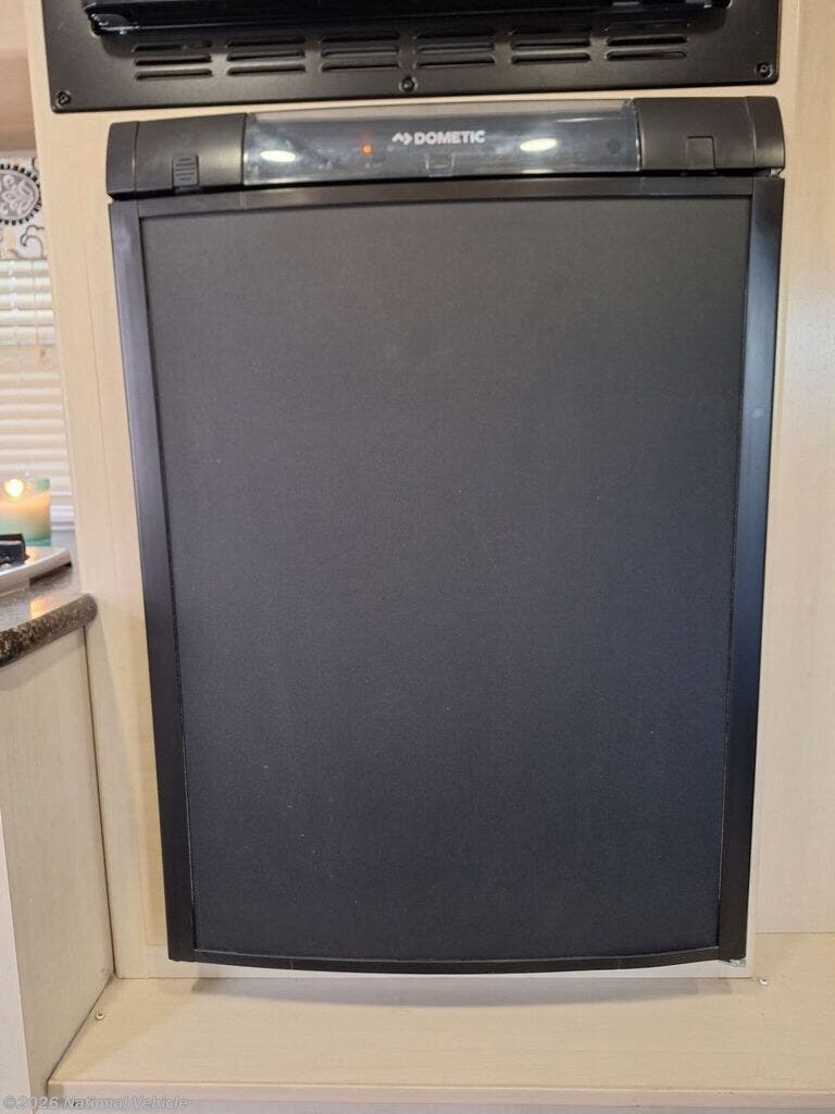 The kitchen is fully equipped for life on the road, including a microwave, stove, and refrigerator/freezer, making it easy to prepare everything from quick snacks to full campground dinners. Thoughtful storage and counterspace add to the convenience, ensuring you can travel comfortably without sacrificing essentials.
