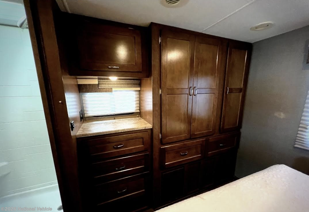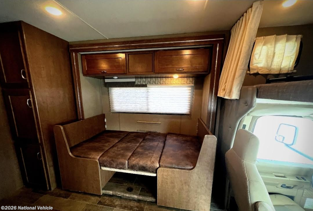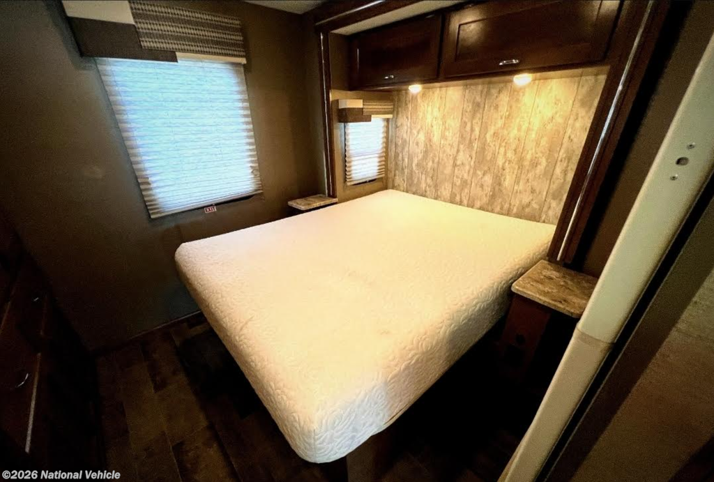 Inside, this coach features a rear bedroom with a queen bed and wardrobe storage, a full bathroom, and a versatile living area with a sofa and dinette, both convertible into additional sleeping space. The cab-over bunk provides extra sleeping options, perfect for accommodating family or guests. Large windows throughout the interior fill the space with natural light, creating a bright and inviting atmosphere.