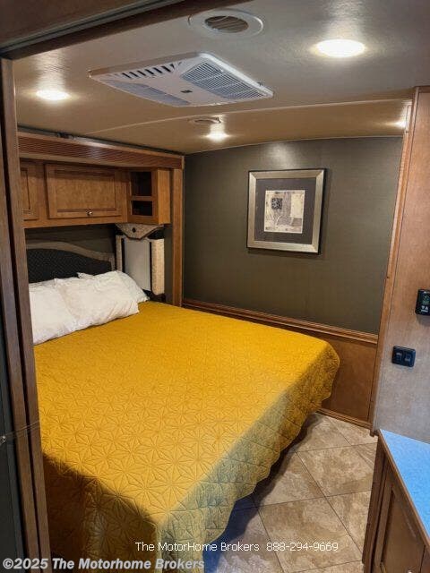 The fully enclosed private bathroom is located in the center of this coach. Through sliding doors we find the master bedroom suite with a 3rd. slide-out, a king bed with underneath storage, a large double door wardrobe, dresser/storage cabinet, LED TV and so much more.