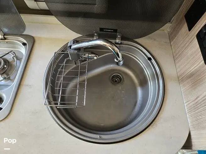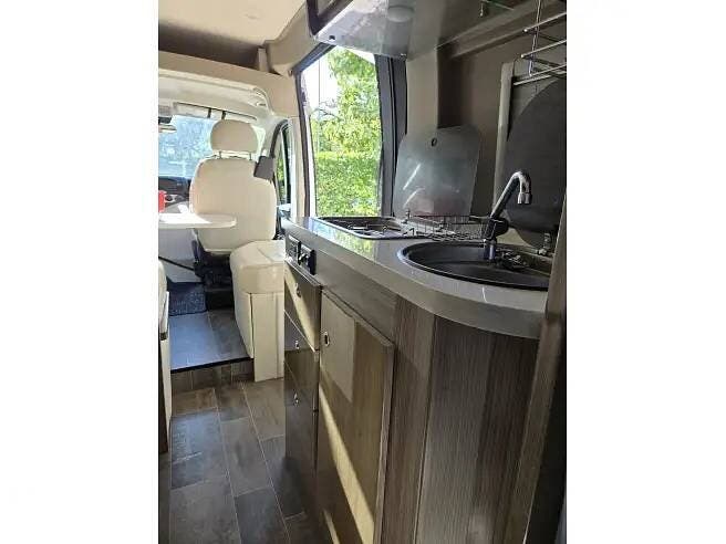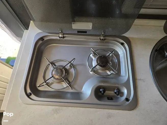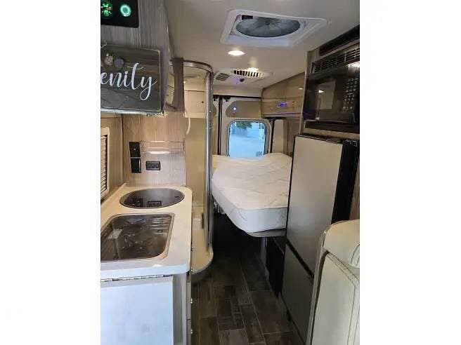 A well-equipped kitchenette sits midsection, with a two-burner cooktop, sink, and refrigerator, offering easy meal prep while on the road.