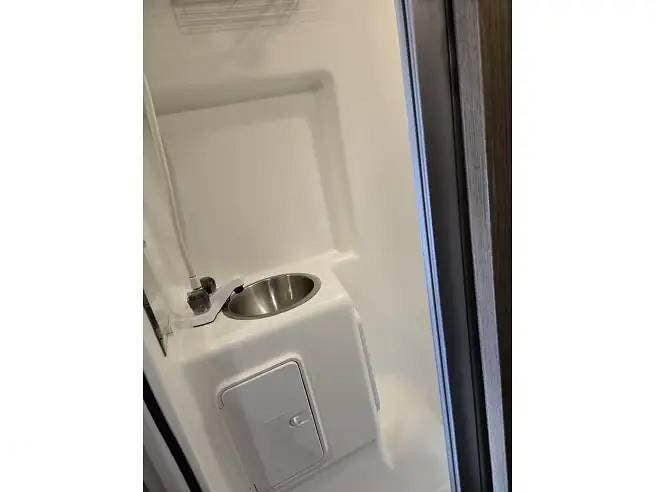 At the rear, a Murphy-style bed can be raised to reveal additional storage, combining sleeping comfort with cargo flexibility. At the opposite corner, a wet bath combines shower and toilet into a single, space-saving unit.