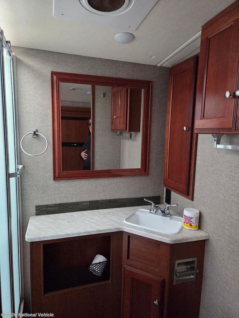 Toward the rear, the private bedroom offers a cozy retreat with a walk-around king bed, dual wardrobes, and overhead storage. Additional sleeping options?including the dinette, sofa, and the powered StudioLoft bed?make this Vista ideal for families or guests. The mid-coach bathroom features a spacious shower, vanity, and linen storage, providing all the comforts of home while on the road.