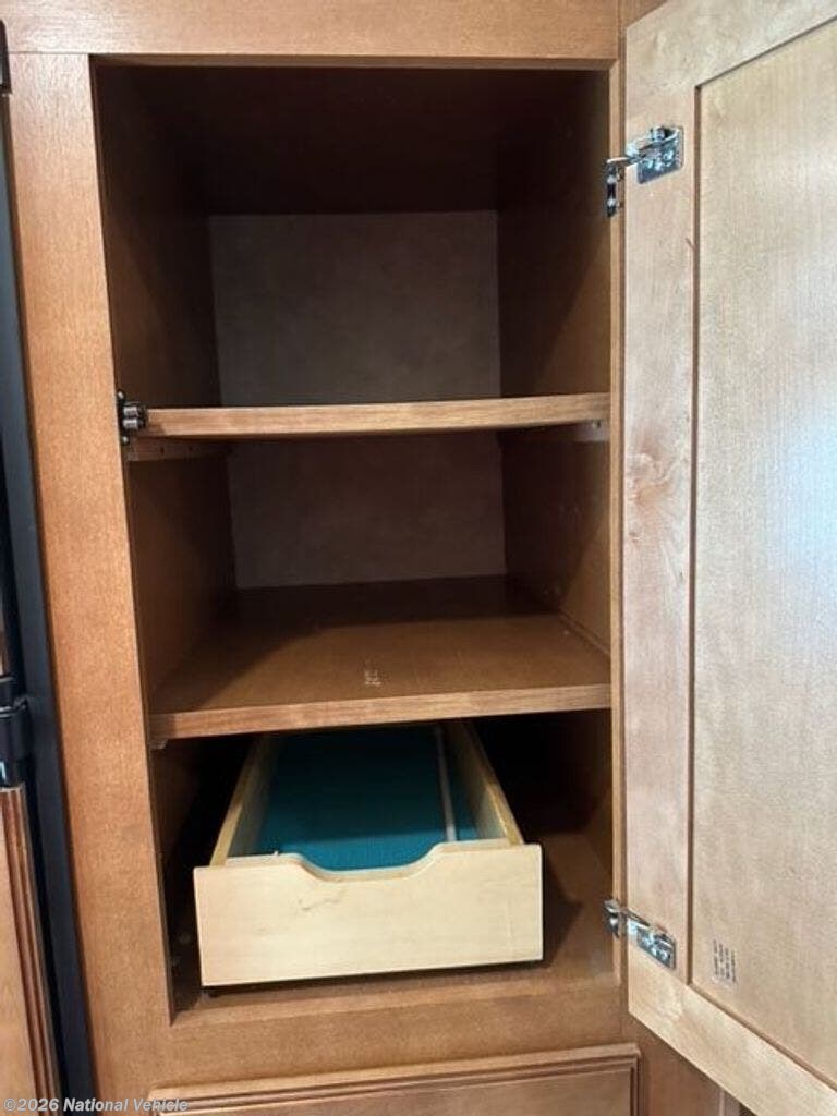 To the left of the entry door find a large wall slide featuring the kitchen appliances, and chest of drawers inside the bedroom. The L-shaped counter features a double kitchen sink, overhead storage, a three burner range, refrigerator, and a pantry.