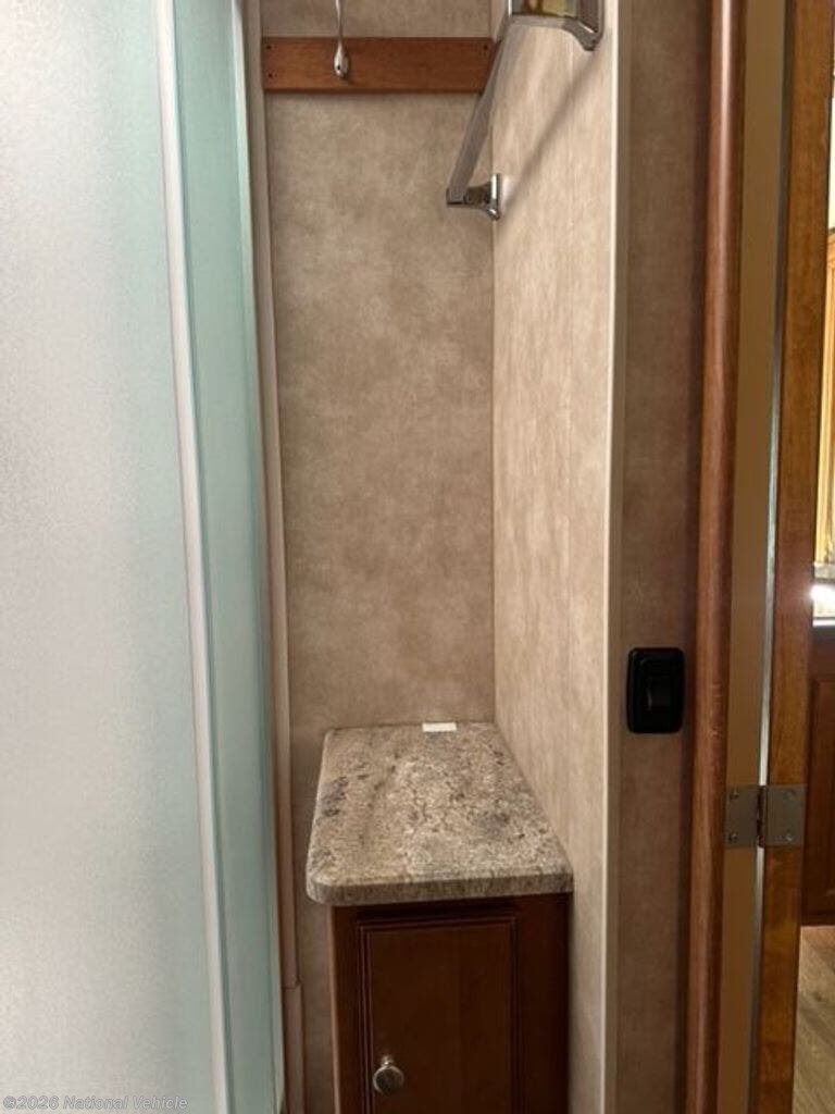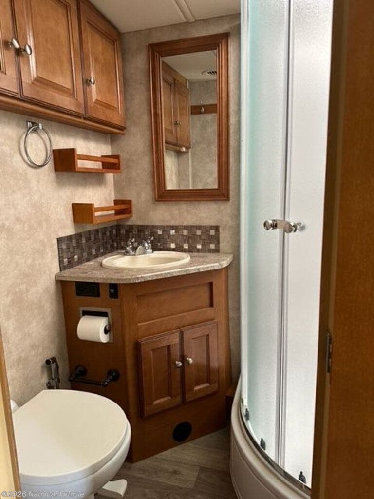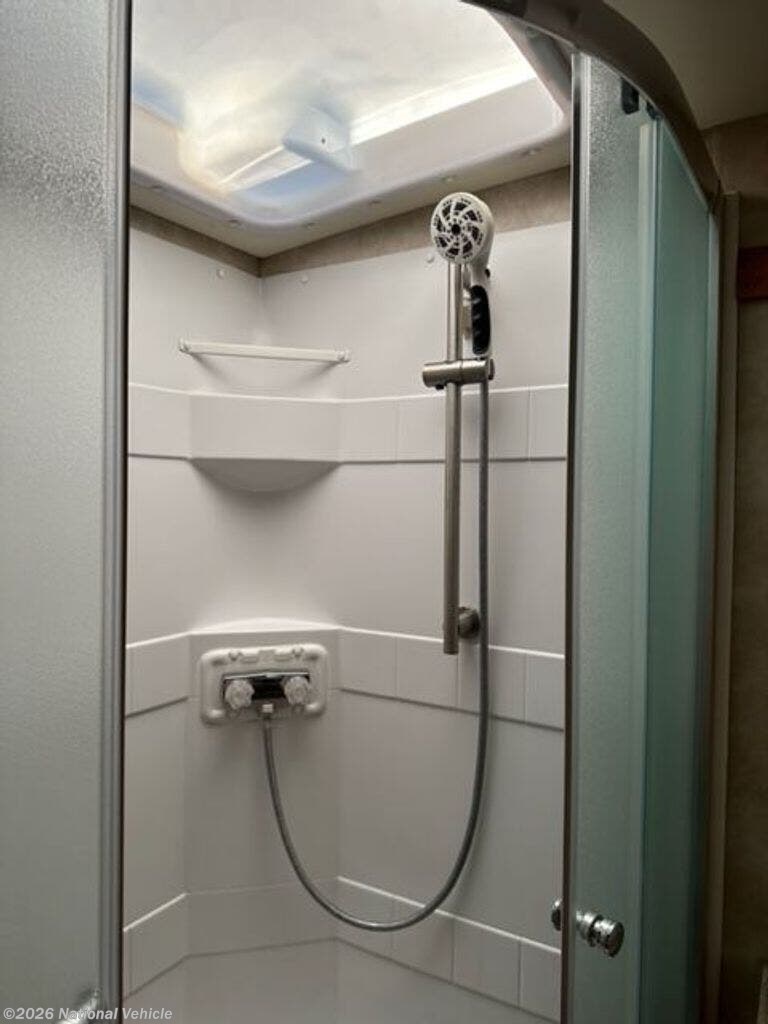 A convenient bath is located in the center of the coach and features a kidney shaped shower, corner sink, toilet, and storage cabinet.