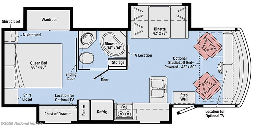 Along the outer bathroom wall is the location for a living area 48" HDTV. There is also an optional powered StudioLoft Bed that can be lowered with the push of a button for additional sleeping space.