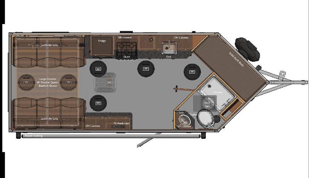 The 2019 Yetti is equipped with everything you'll need for your ice fishing voyages or camping adventures. There's a well-appointed kitchen that includes a stove, oven, microwave, refrigerator, and sink, giving you all the conveniences of home while on the road or on the ice.