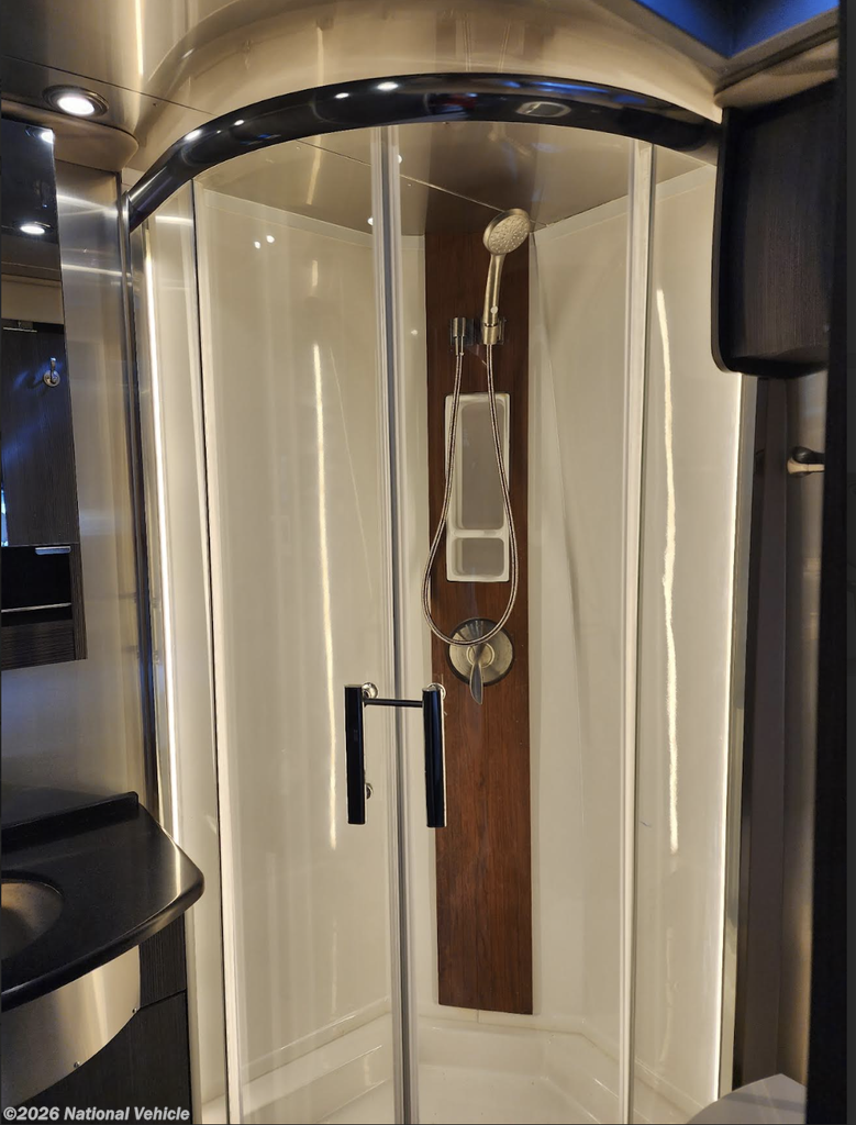 The fully equipped galley kitchen features a convection microwave, induction cooktop, stainless steel sink, and a large refrigerator, making meal prep effortless wherever your journey takes you. At the rear, enjoy a large residential-style 3-piece bathroom complete with teak shower inlays and a tankless water heater, offering a true spa-like experience on the road.