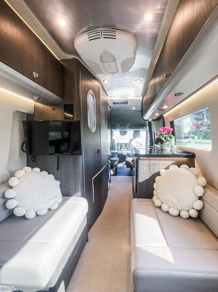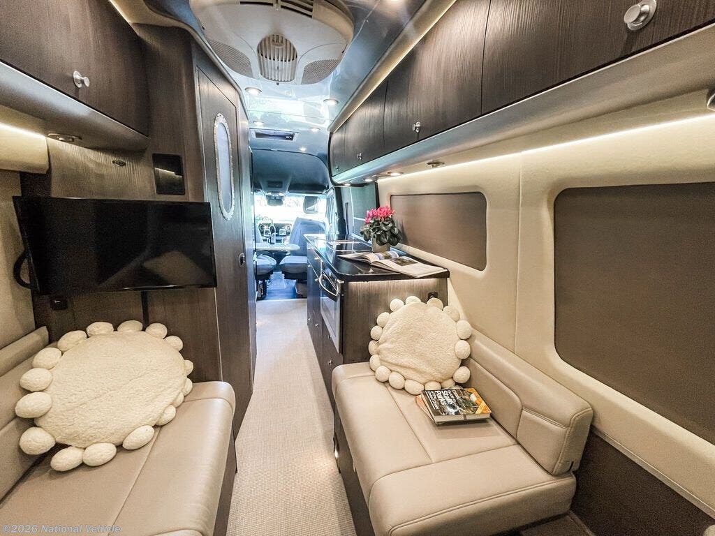 Inside, you?ll find the signature Airstream craftsmanship with high-end finishes, modern styling, and intelligent use of space. The Grand Tour layout offers a spacious and inviting lounge area with premium seating that easily converts into a comfortable sleeping space. Rich cabinetry, solid-surface countertops, and ambient LED lighting create a sophisticated, upscale environment perfect for both relaxing and entertaining.
