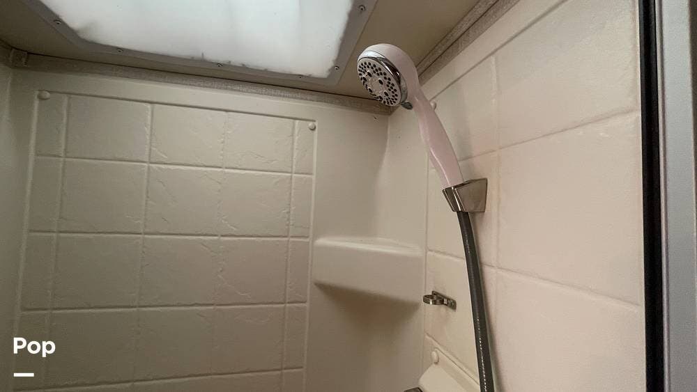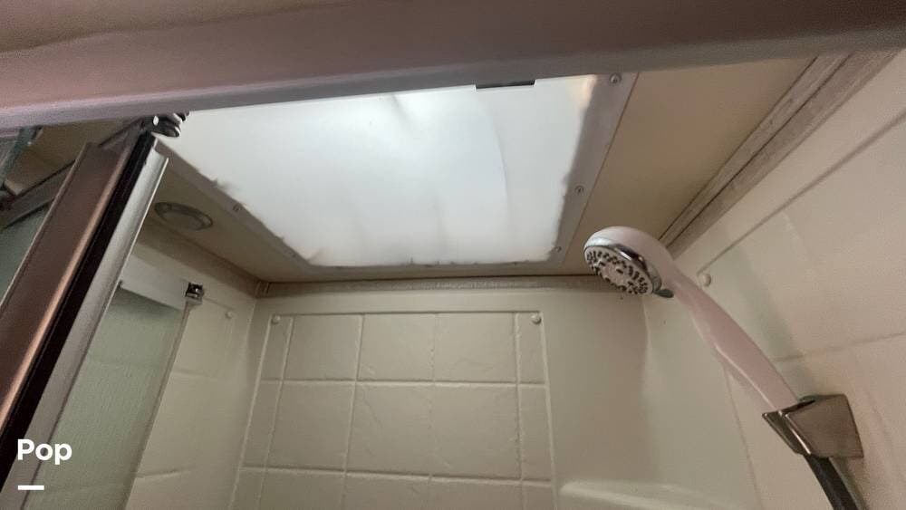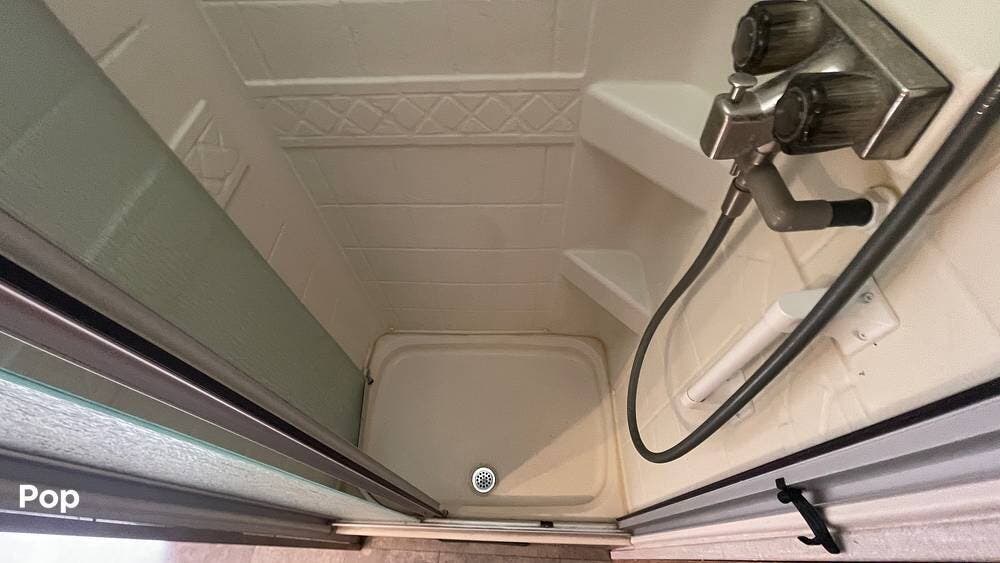 Enjoy a full bath with a glass shower door, plus a power porch awning for shaded outdoor living.