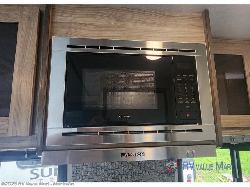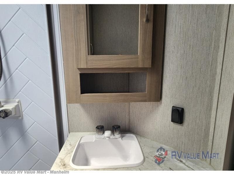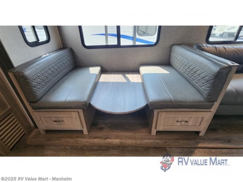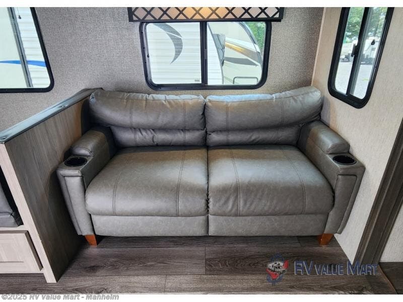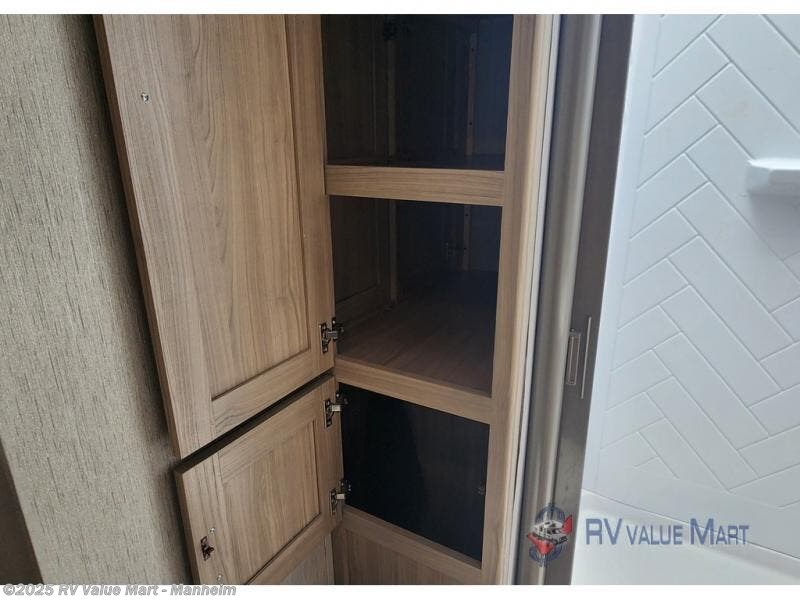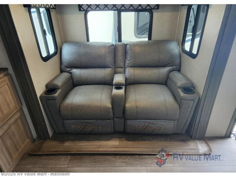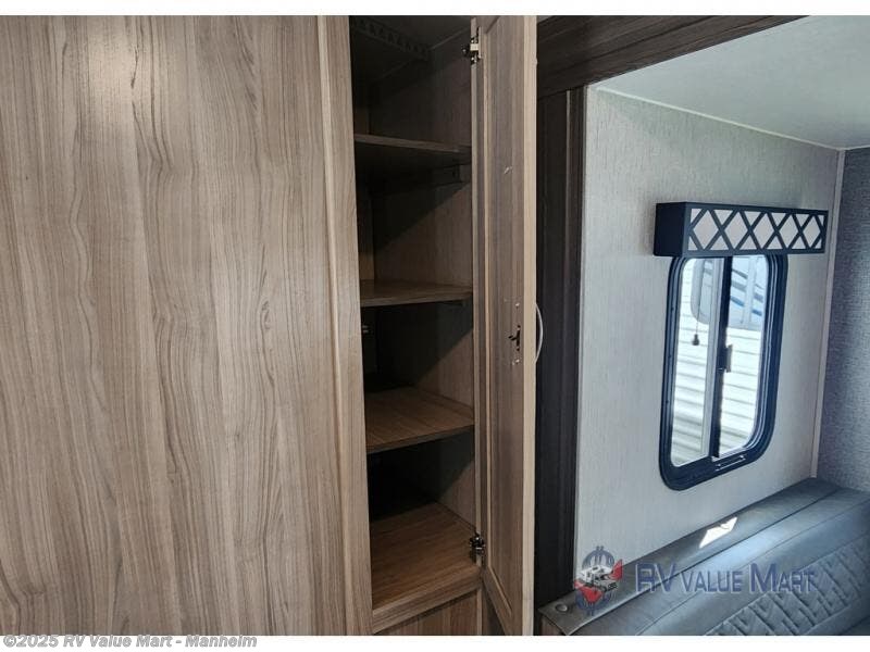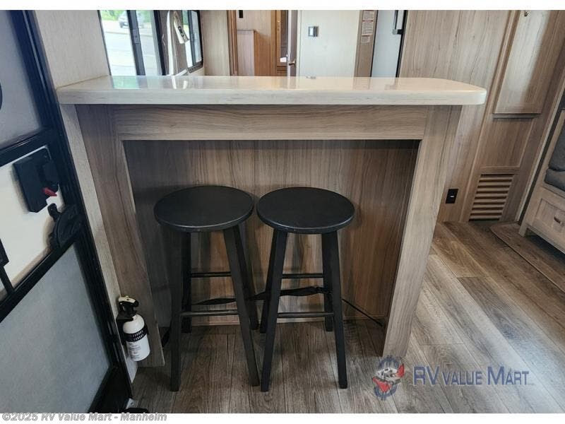 If you enjoy entertaining other RVers, you are in luck with this travel trailer! Everyone can gathering in the main area while watching the pop-up TV above the fireplace, relax on the hide-a-bed sofa or dinette, and enjoy the heat, massage and LED lighting in the theater seating. You'll find bar stools at the bar top so your guests can visit with the cook while they make snacks and drinks for everyone. You might even take the party outside under the power awning and make a few snacks on the camp kitchen. When you are tired, you can retire to your master bedroom in the rear that includes lots of storage and a countertop to place your things, plus the second entry/exit door as another convenience.