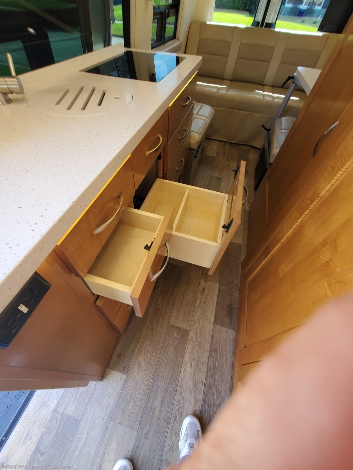 Experience luxury on the road with the meticulously designed interior of the Galleria 24FL. The layout boasts a front lounge with a comfortable power-reclining sofa, a galley featuring a solid surface countertop, a recessed sink, a double induction cooktop, a convection microwave, and a sizable 7.2 cu. ft. refrigerator with a freezer to accommodate all your culinary needs. The efficient wet bath maximizes space while providing modern fixtures, including a high-rise faucet. Additional features include ample storage in high-gloss Maple cabinetry, intricate smart technology controls with the Firefly Multiplex system, and amenities such as a 24-inch Jensen LED Smart TV, a WIFI booster, DVD, large power armless awning. This virtually new Galleria is also equipped with premium aluminum wheels, a backup camera, and essential upgrades like privacy curtains and Sumo Springs for a smoother ride.