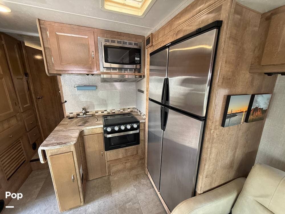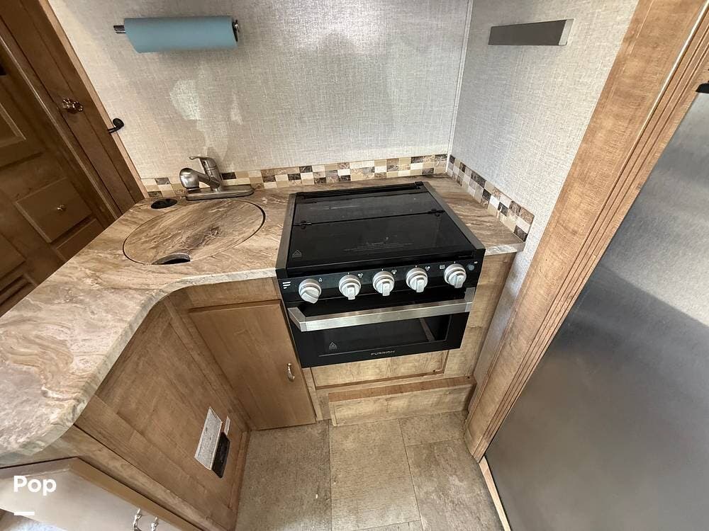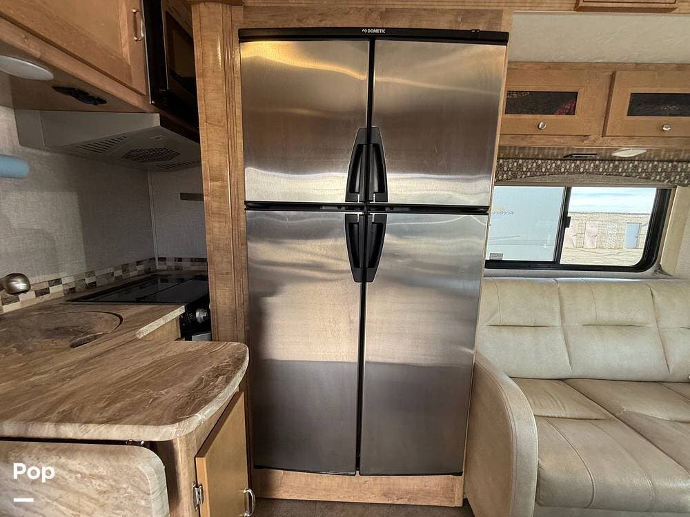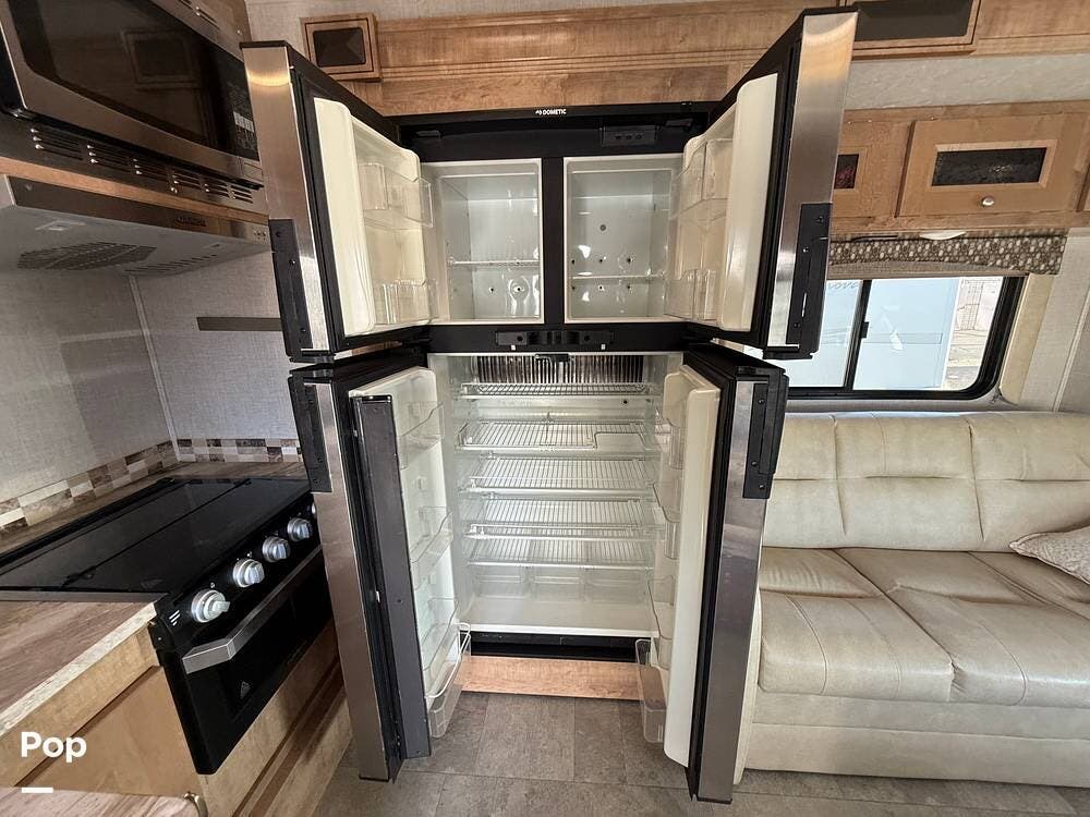 The interior has a nice setup as well. The kitchen offers everything needed to cook nice meals while traveling. The four-door refrigerator/freezer is a nice feature. It provides plenty of space to store cold items while traveling.