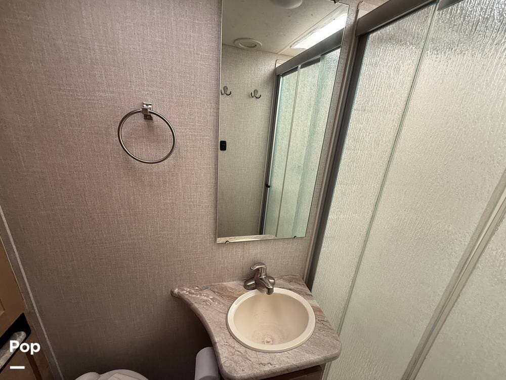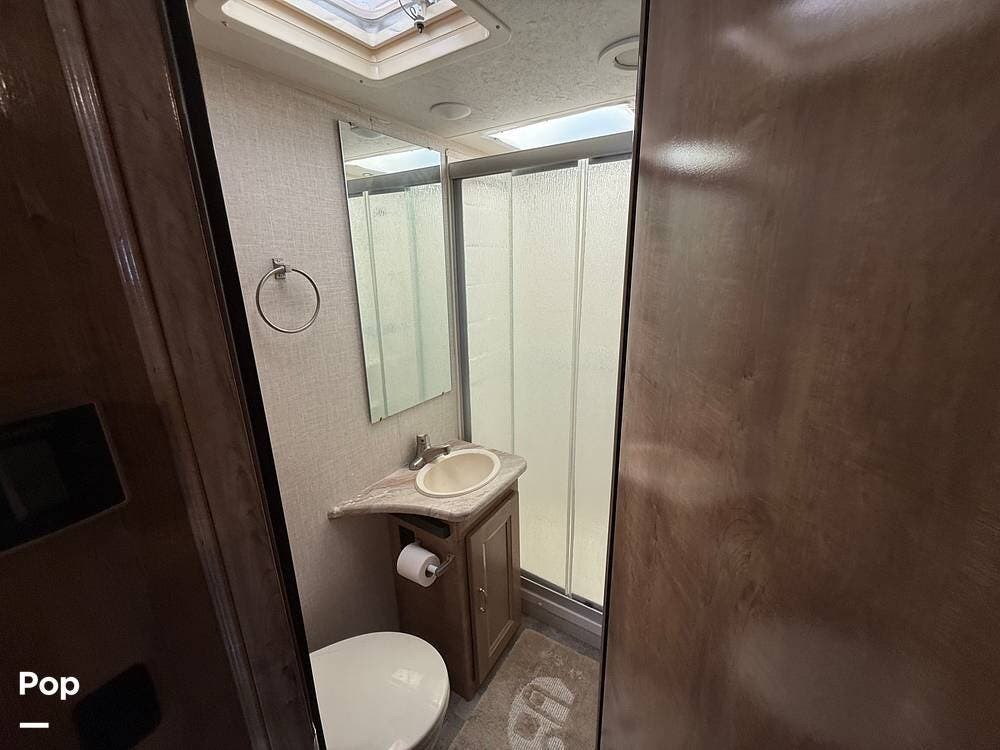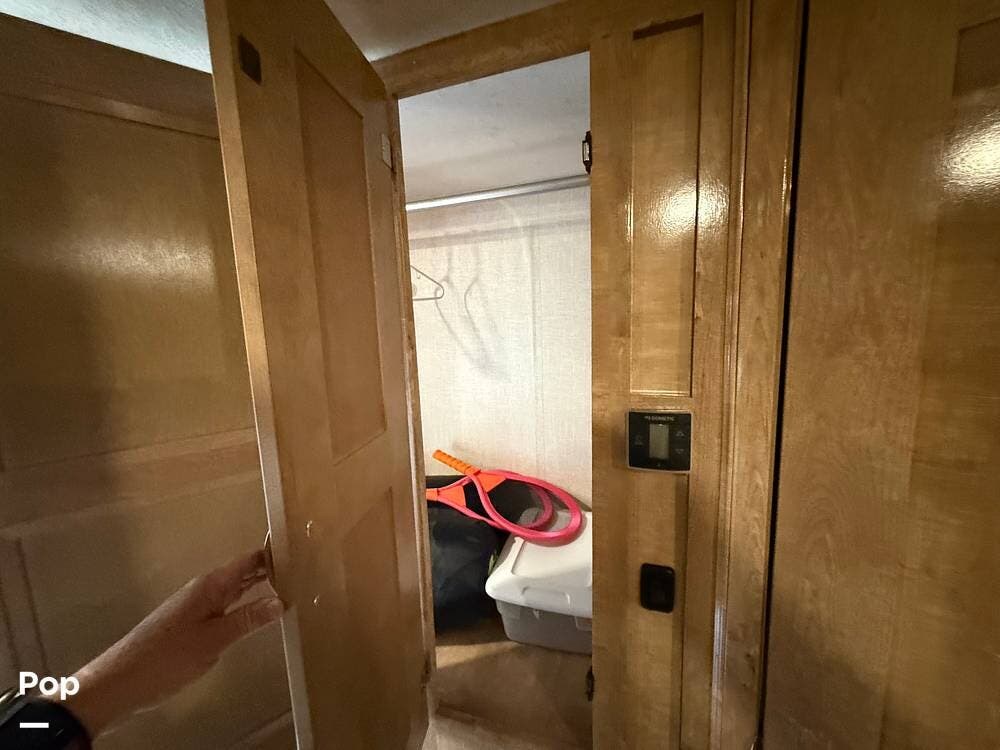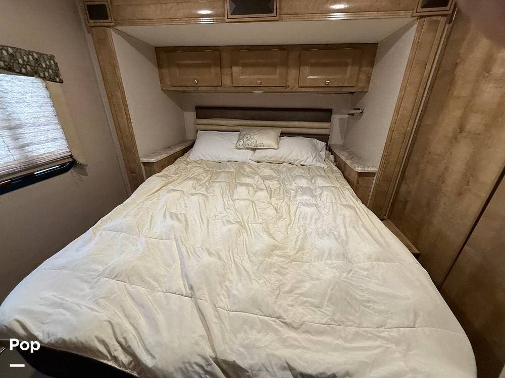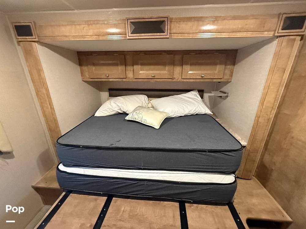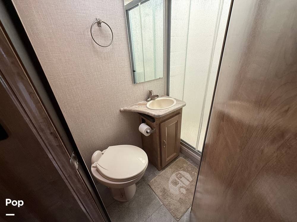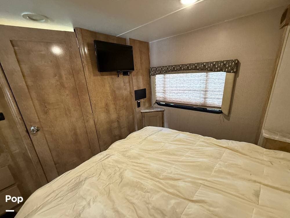The bedroom is in the rear of this RV. It has a queen-size bed. The bed folds up so the slide-out can be retracted. The bathroom is easily accessible from the bedroom.
