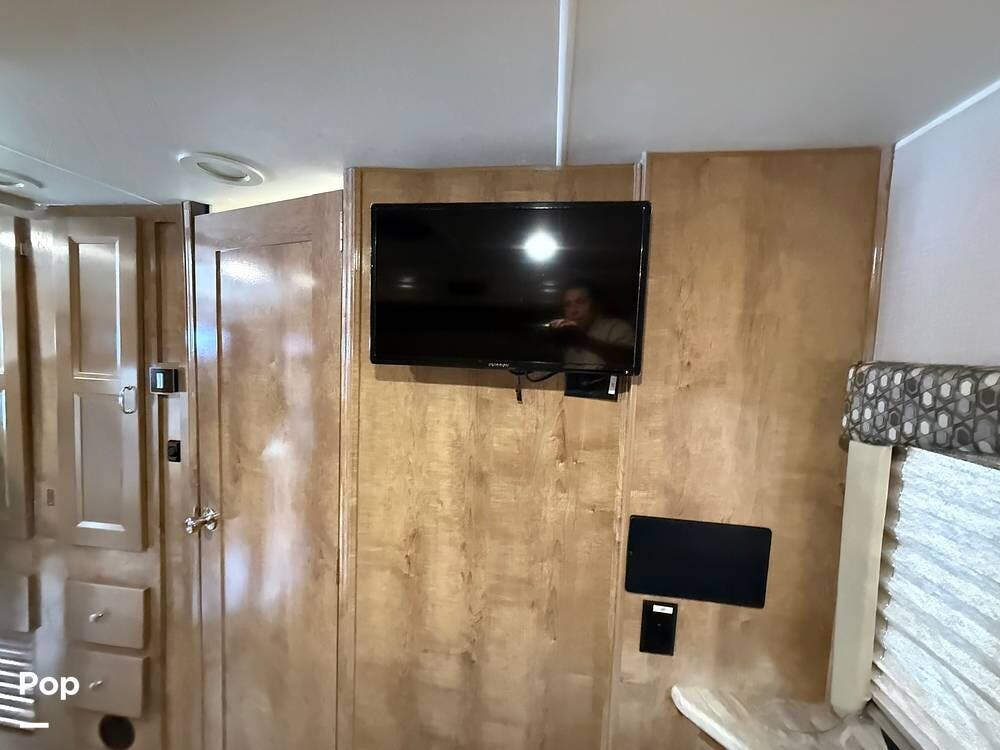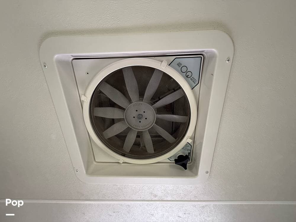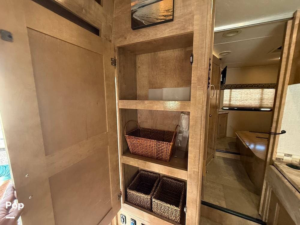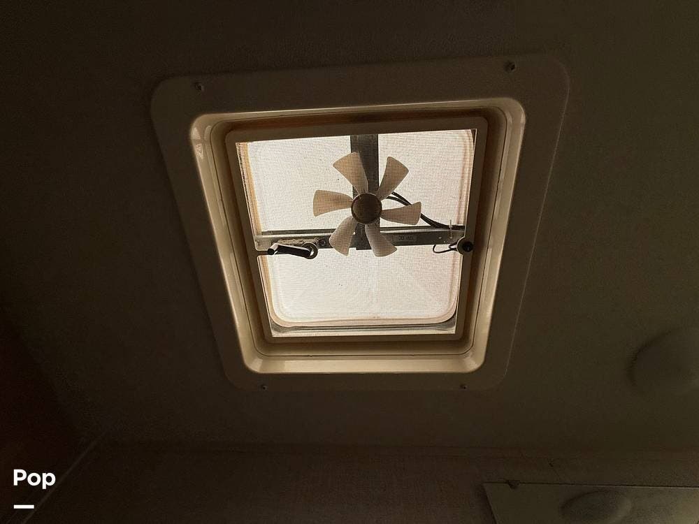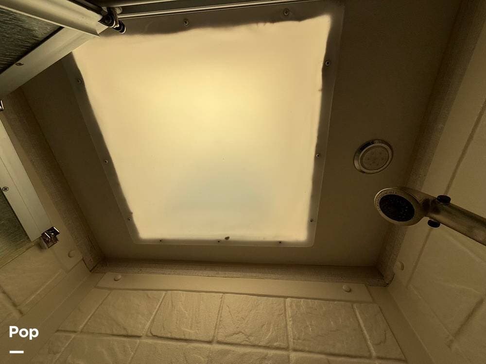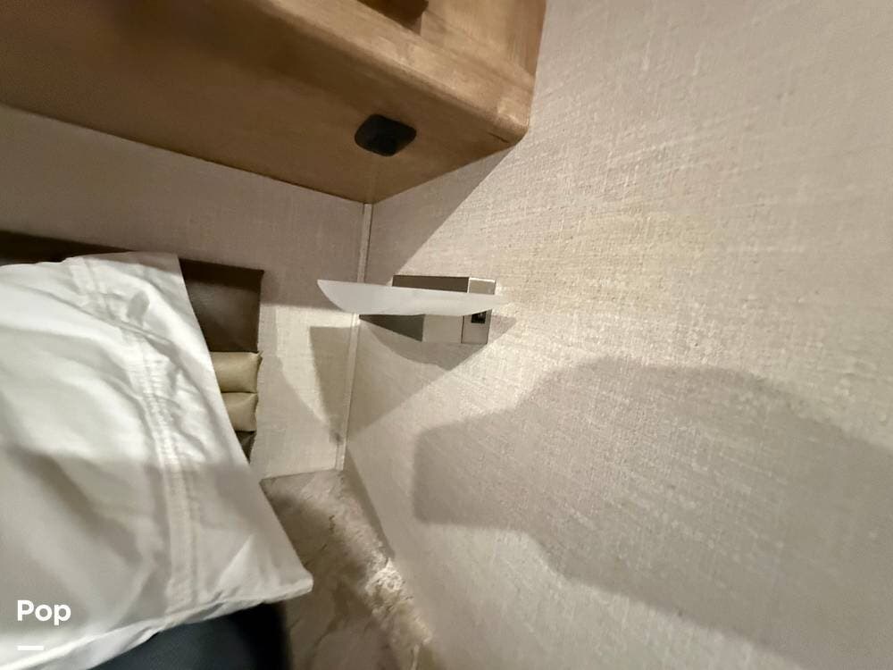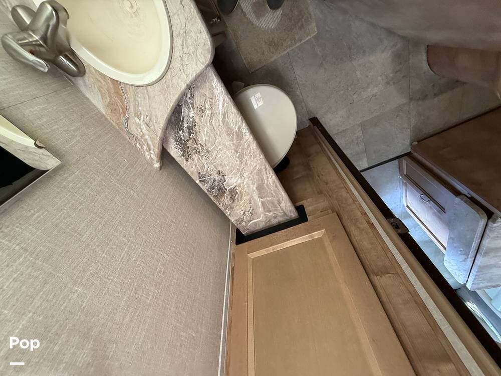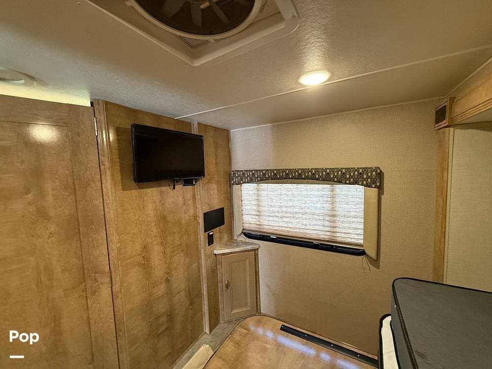 The bedroom is in the rear of this RV. It has a queen-size bed. The bed folds up so the slide-out can be retracted. The bathroom is easily accessible from the bedroom.