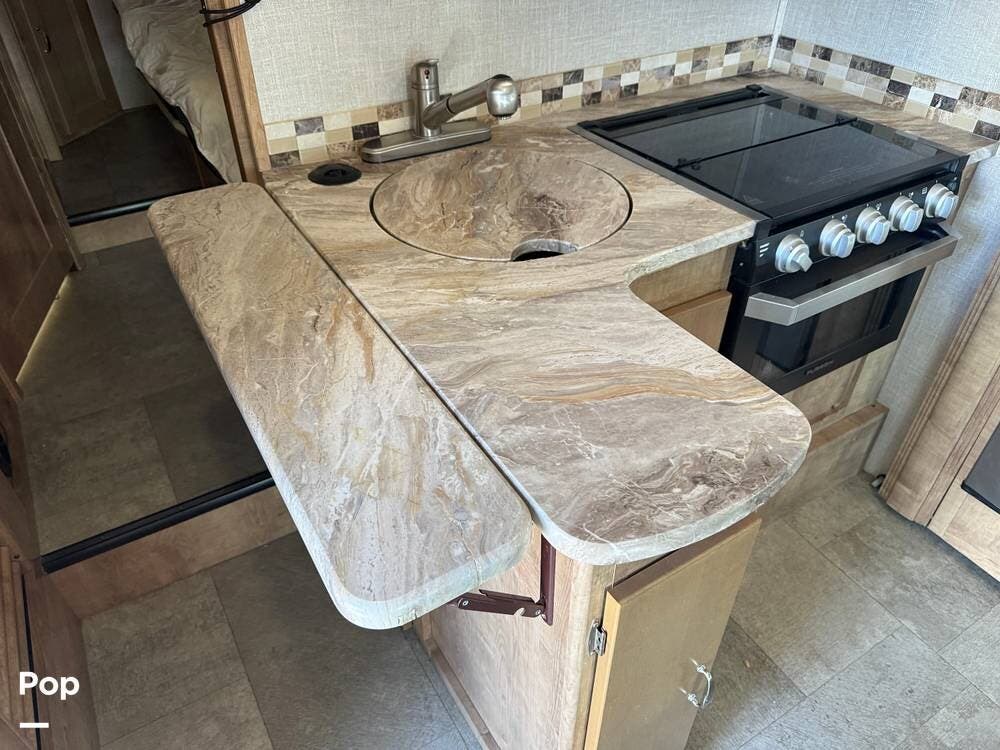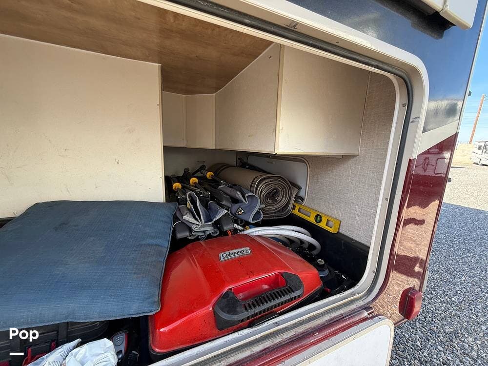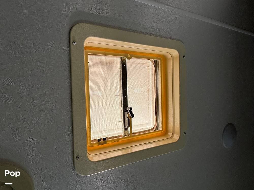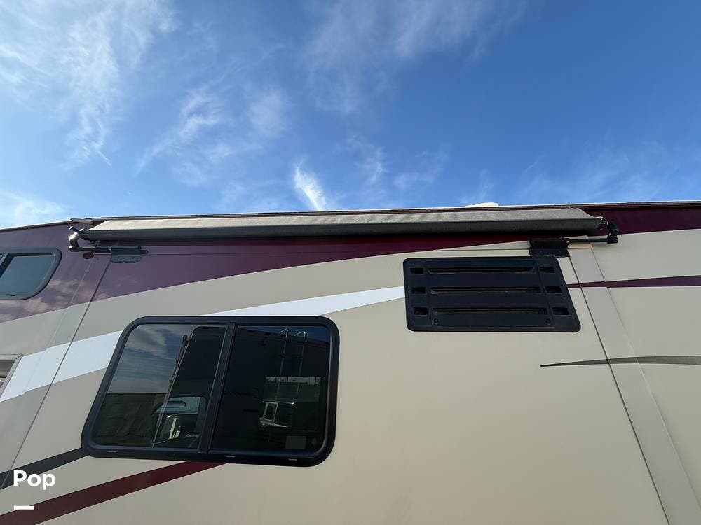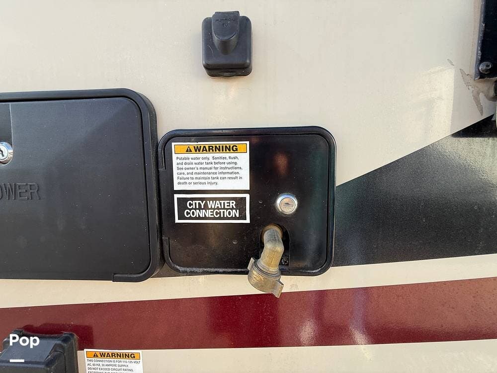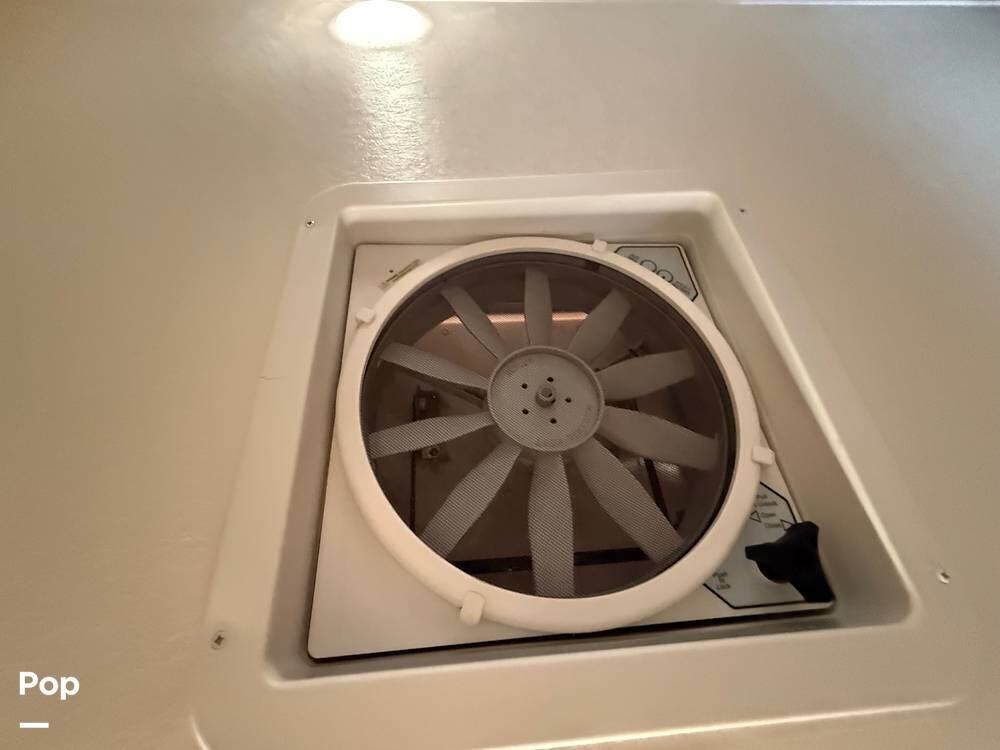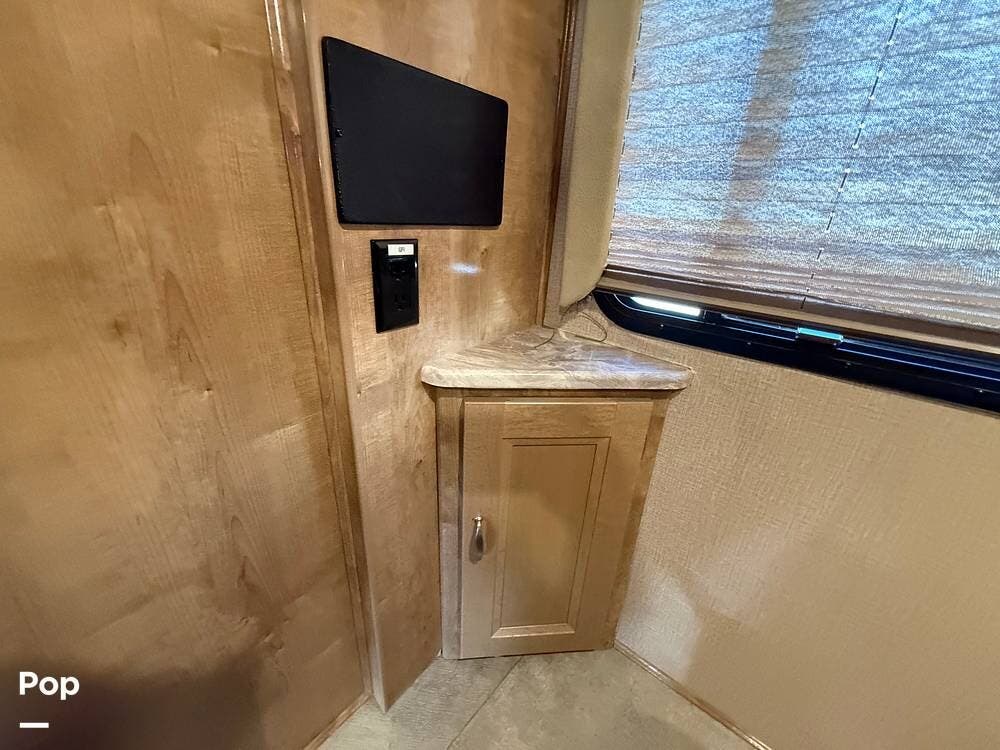 The bedroom is in the rear of this RV. It has a queen-size bed. The bed folds up so the slide-out can be retracted. The bathroom is easily accessible from the bedroom.