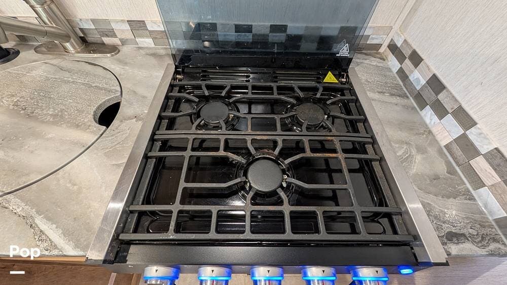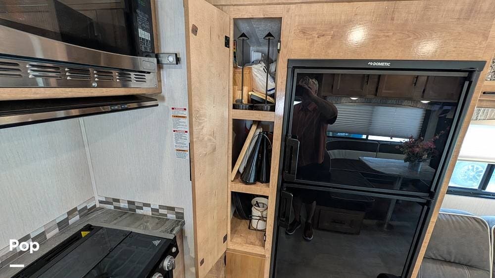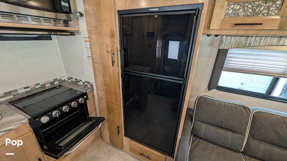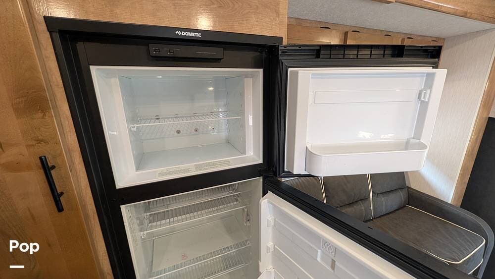 The interior has plenty of amenities, including a kitchen with everything you need to cook for the whole crew, with a 3-burner stove and a convection microwave. It also has a full-sized Dometic refrigerator/freezer for long trips, and storage space is abundant.