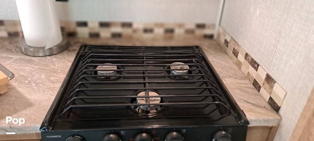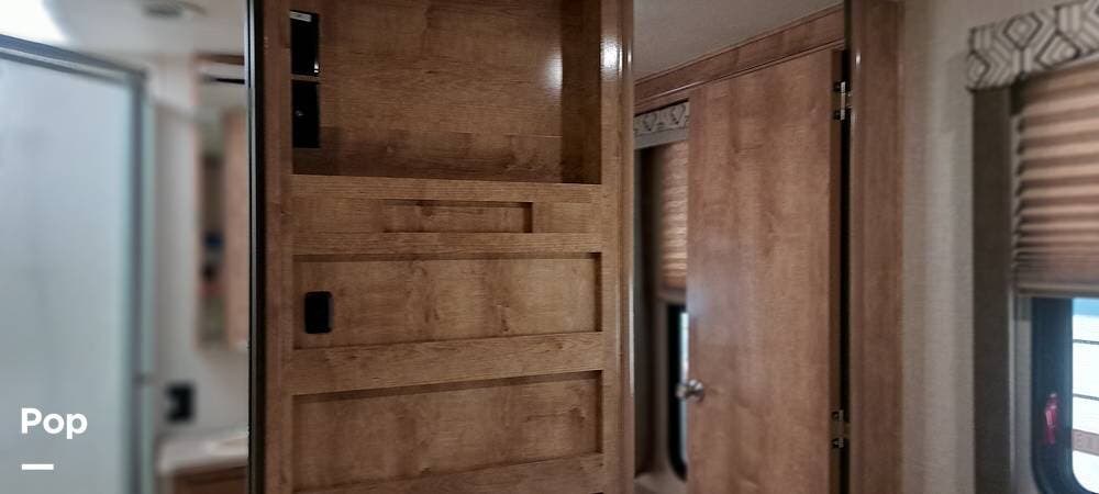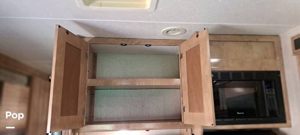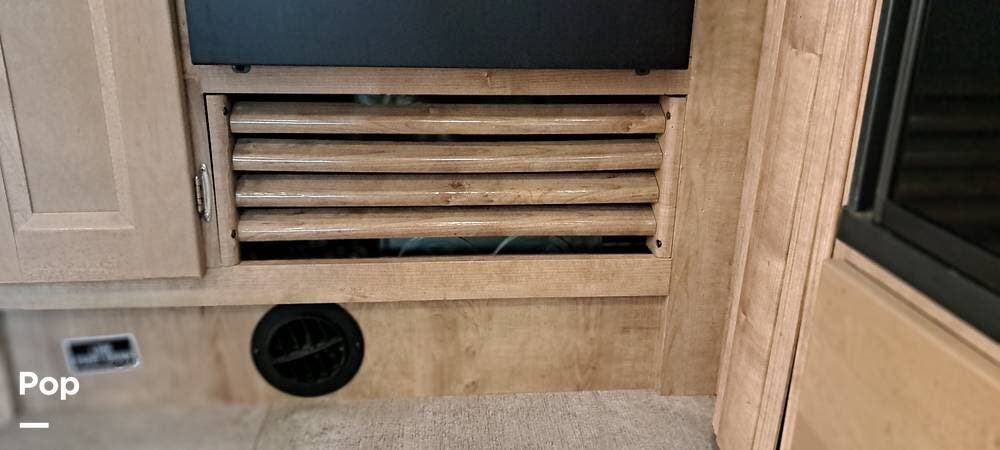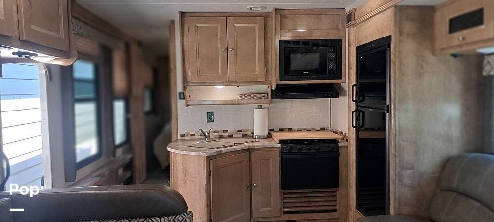 Another key feature is the fully equipped kitchen, which includes a three-burner cooktop, oven, microwave, and a large double-door refrigerator. The layout is designed for easy meal preparation, with ample counter space and sufficient cabinetry. Whether you're cooking at a campground or boondocking off-grid, the 317SA's kitchen is more than capable of supporting everyday needs.