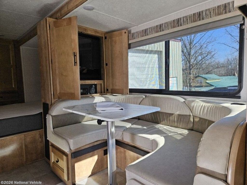 Sleeping accommodations are versatile and comfortable, offering a rear queen bed plus an upper bunk that sleeps two, allowing this compact coach to comfortably accommodate family or guests. The private bathroom with enclosed shower adds residential convenience on the road.