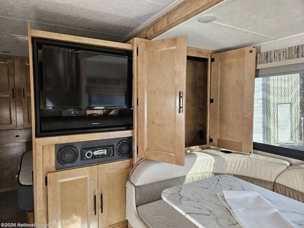 Inside, you?ll find a thoughtfully designed interior that maximizes space and comfort. The living area includes two flat-screen TVs for entertainment, a well-appointed galley with microwave, gas cooktop, sink, refrigerator (no ice maker), and a small freezer, making meal prep easy whether you?re on a weekend getaway or extended trip.