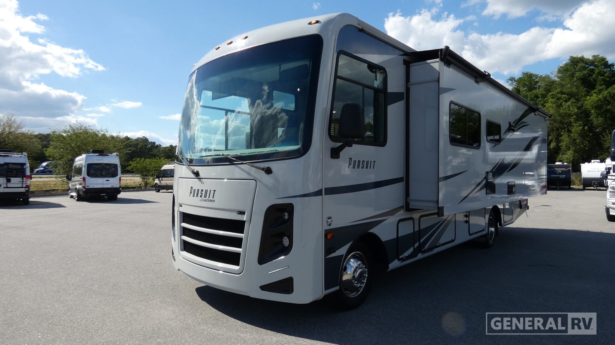 Experience the open road like never before with the 2020 Coachmen Pursuit Precision 29SS. This motorhome is designed to transform your travels into unforgettable adventures. At just over 30 feet in length, this RV offers a spacious yet manageable size, perfect for both seasoned travelers and those new to the RV lifestyle. The front living area boasts a cozy sofa with storage and an optional theater seating arrangement, making it the ideal spot for relaxing after a day of exploration. The drop-down overhead bunk provides additional sleeping space, ensuring everyone has a comfortable place to rest. The center kitchen is well-equipped with a three-burner cooktop and a full-size electric refrigerator, making meal preparation a breeze. Enjoy your meals at the dinette, which can also be converted into an extra sleeping area. The rear bedroom features a queen bed, flanked by ample wardrobe space and a 32” LED TV for entertainment. With a powered retractable awning extending 20 feet, you can enjoy the outdoors in comfort and style. The Pursuit Precision 29SS is built on a Ford F-Series Super Duty chassis, powered by a robust Triton V10 engine, offering 320 horsepower and 460 lb-ft of torque, ensuring a smooth and powerful drive. Ready to explore further? Visit your nearest General RV dealership to learn more about this exceptional motorhome and how it can become your perfect travel companion.