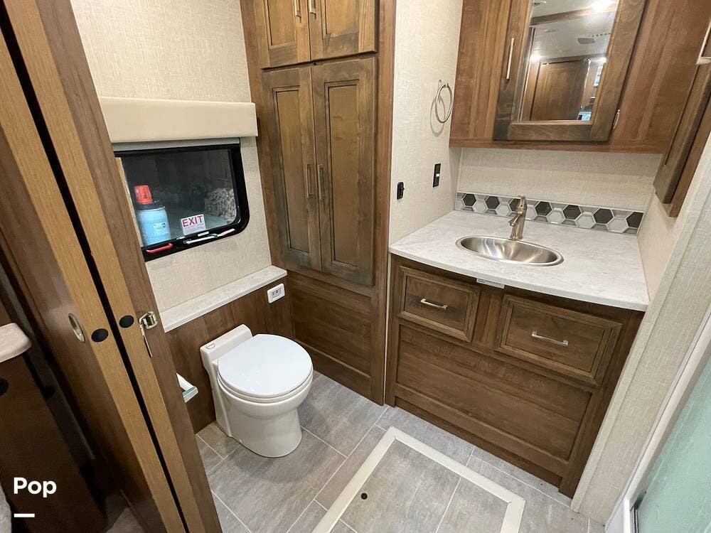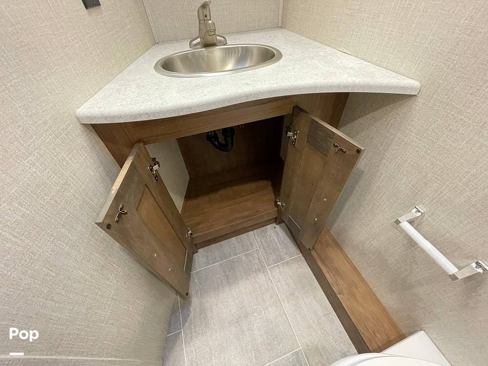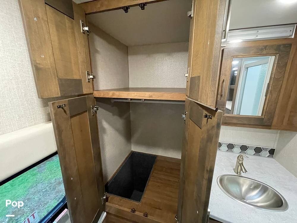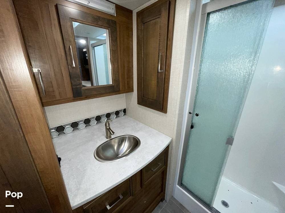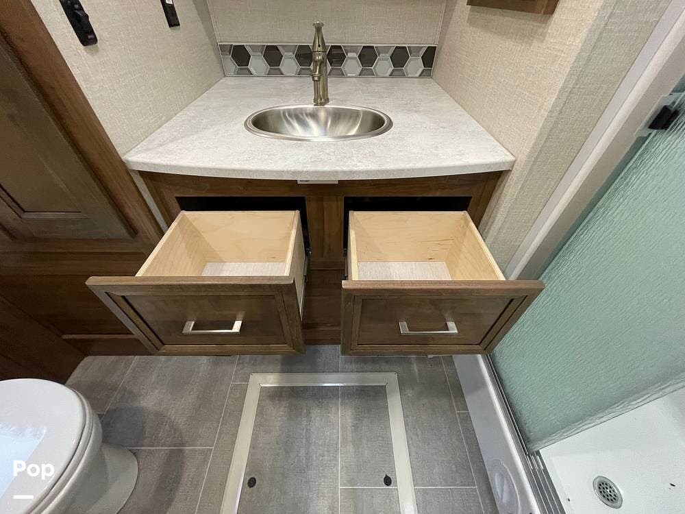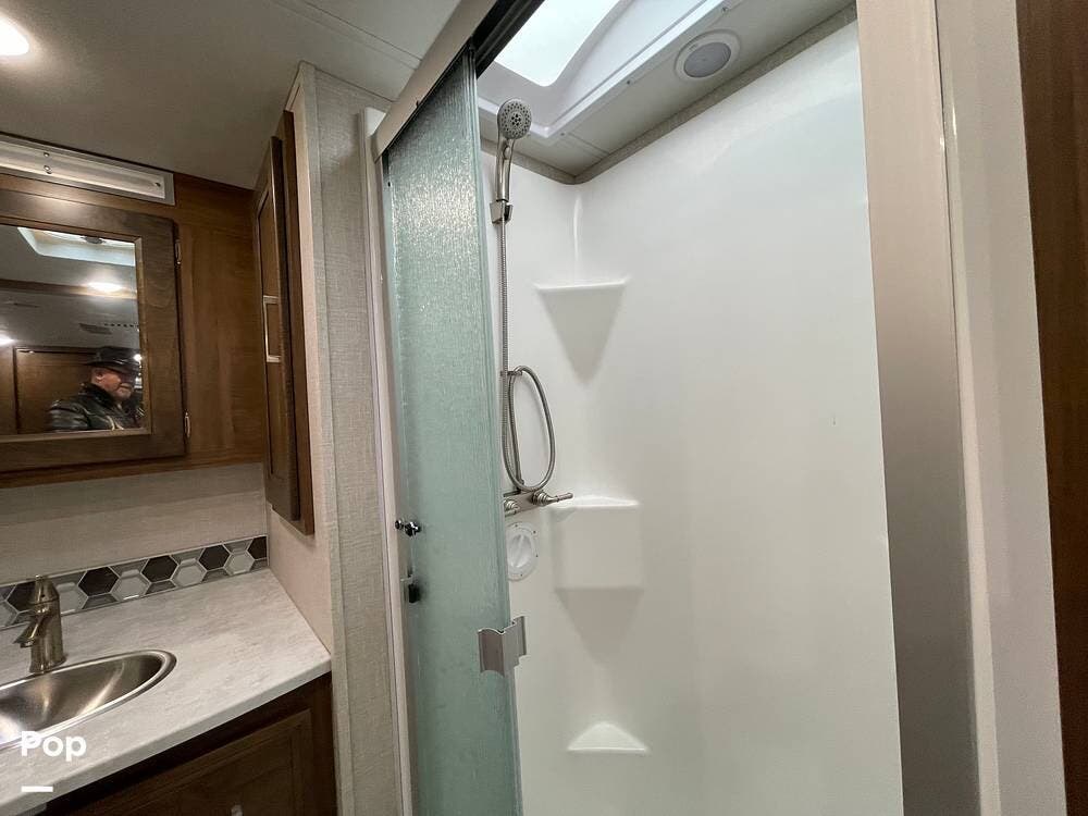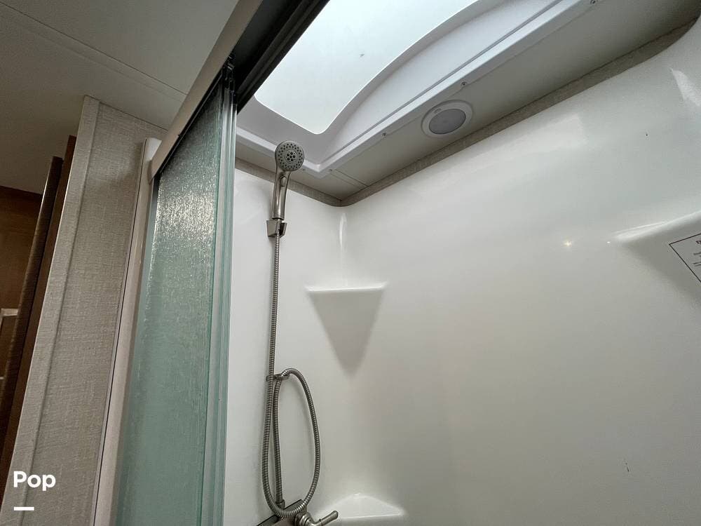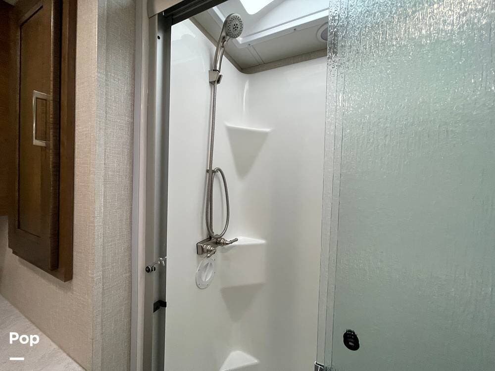 The layout has been thoughtfully designed to make the most of space. The rear bathroom is a standout feature, offering a private and functional retreat. The spacious area includes a large shower with a glass enclosure, a toilet, and a sink with a vanity. The counter space is generous, and there are plenty of cabinets for storage. Natural light filters through strategically placed windows, creating a bright, airy atmosphere. The ample storage, sleek design, and efficient layout make this rear bathroom practical and comfortable for those spending extended time on the road.
