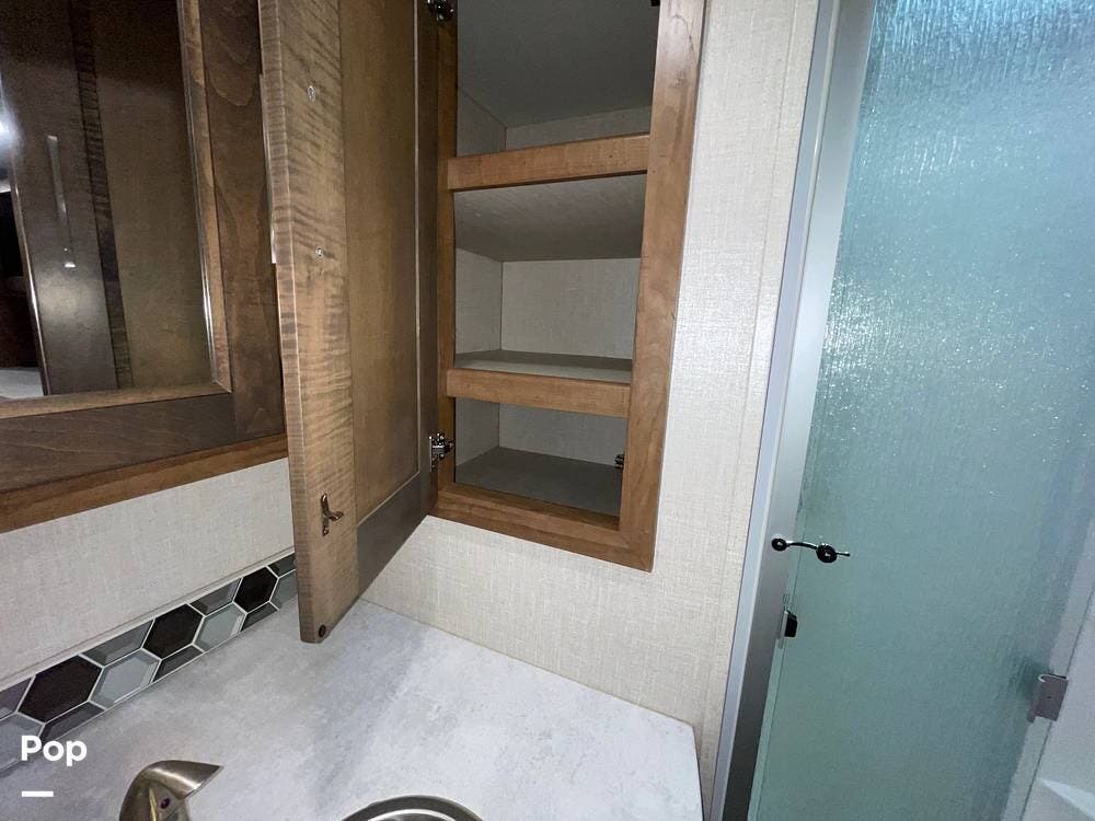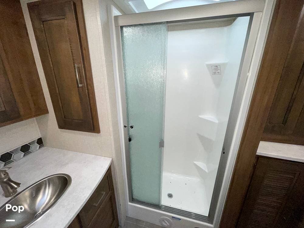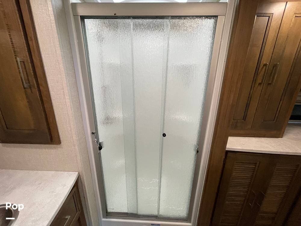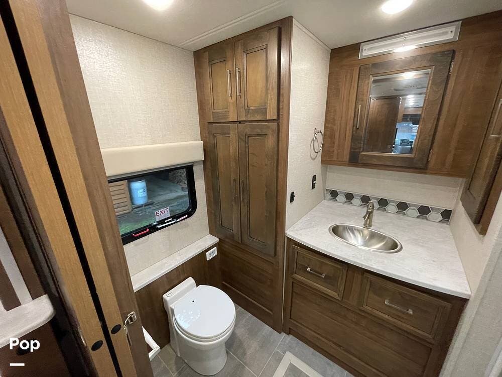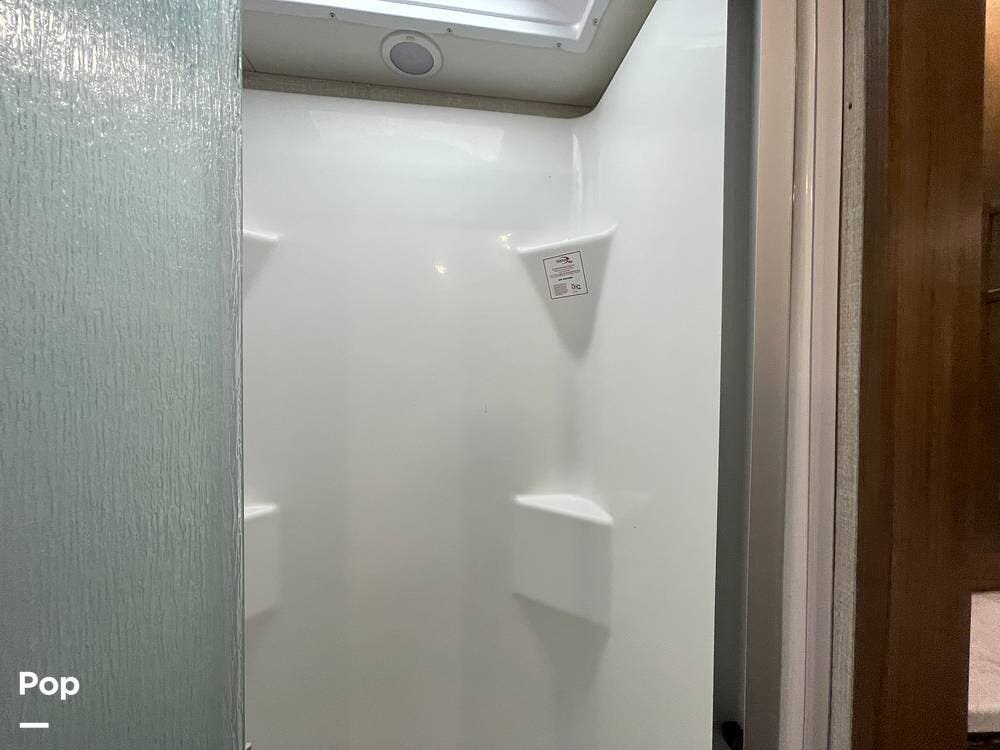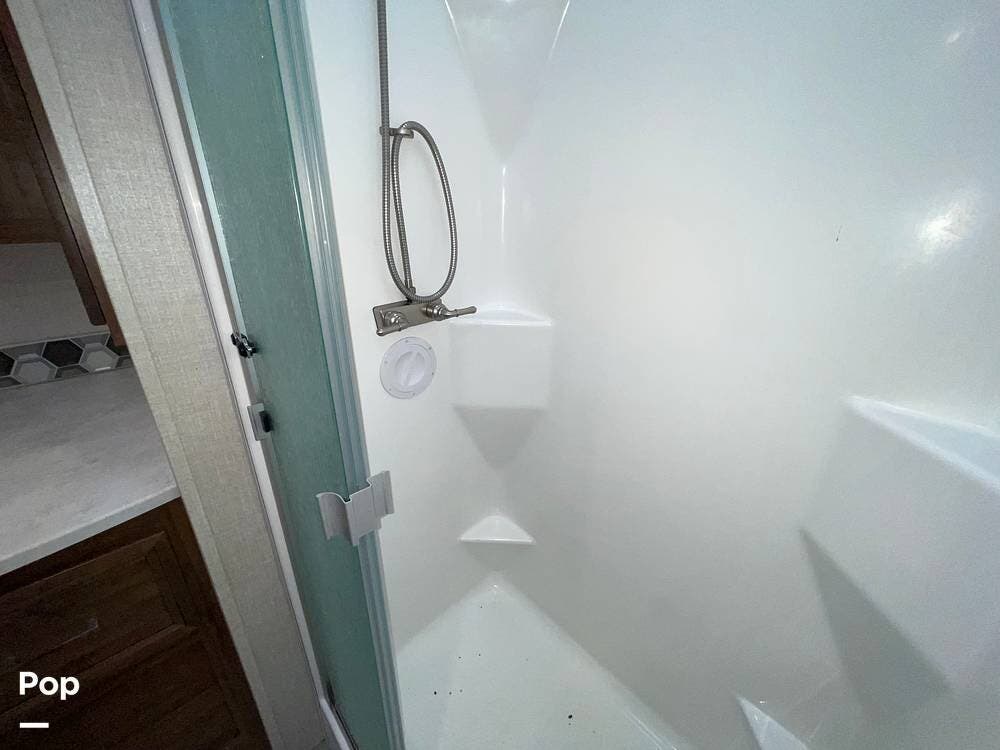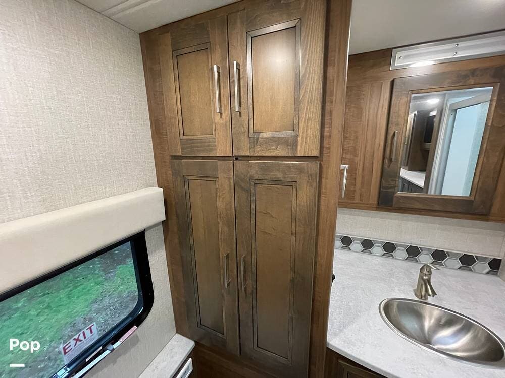 The layout has been thoughtfully designed to make the most of space. The rear bathroom is a standout feature, offering a private and functional retreat. The spacious area includes a large shower with a glass enclosure, a toilet, and a sink with a vanity. The counter space is generous, and there are plenty of cabinets for storage. Natural light filters through strategically placed windows, creating a bright, airy atmosphere. The ample storage, sleek design, and efficient layout make this rear bathroom practical and comfortable for those spending extended time on the road.