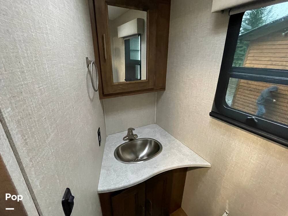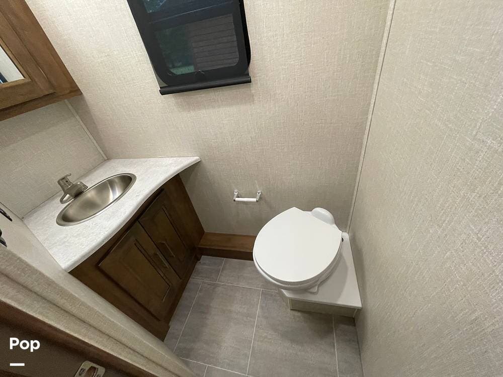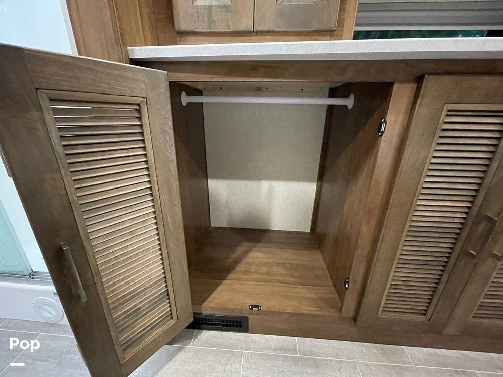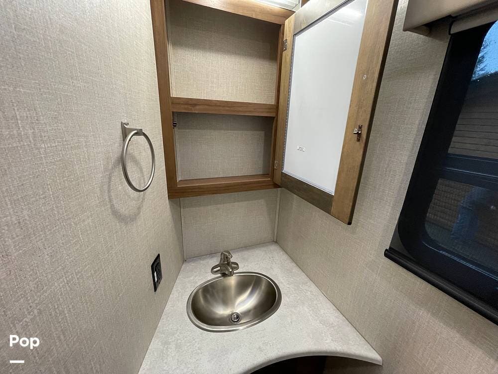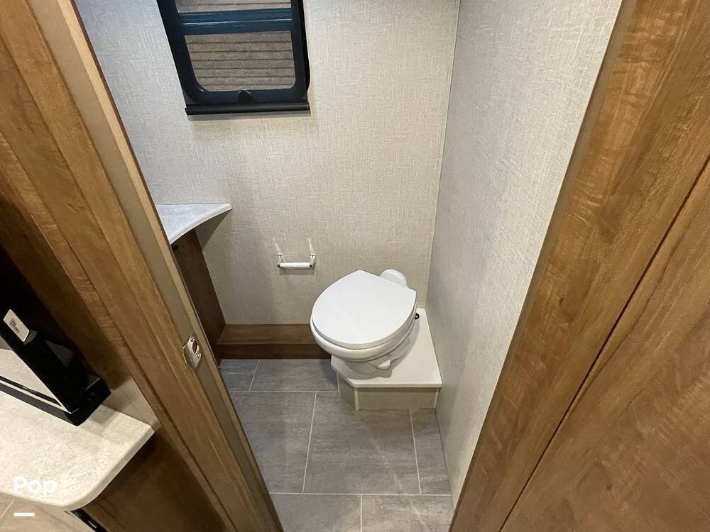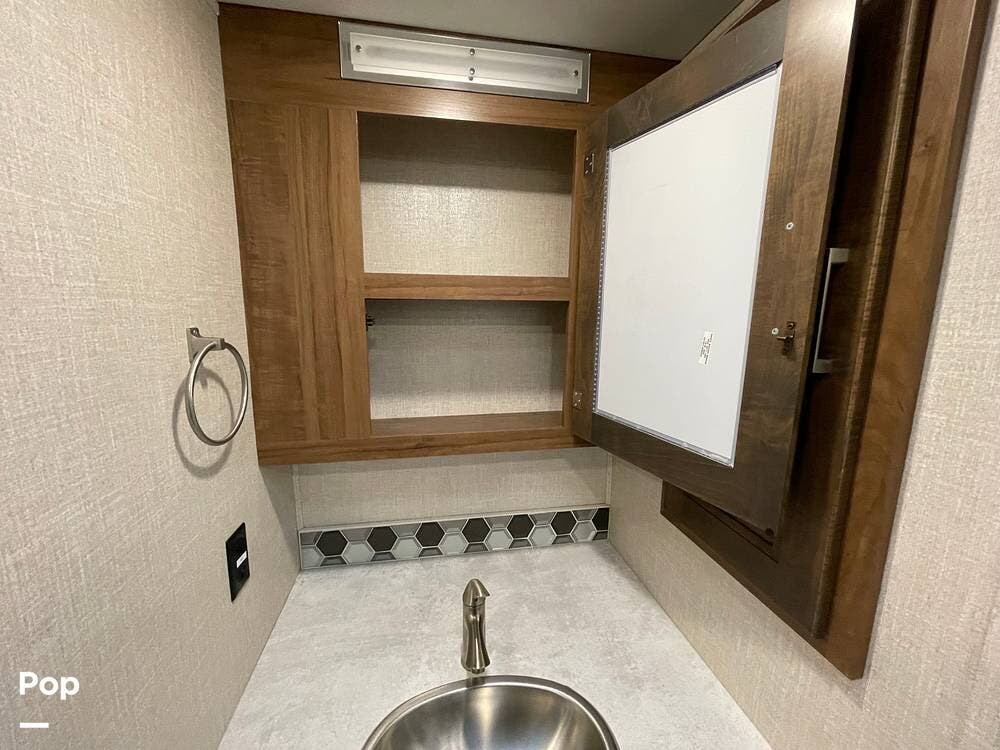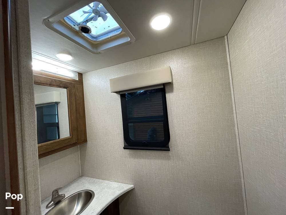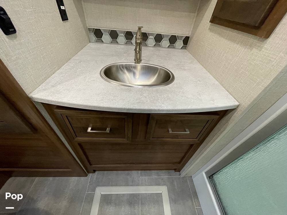 The layout has been thoughtfully designed to make the most of space. The rear bathroom is a standout feature, offering a private and functional retreat. The spacious area includes a large shower with a glass enclosure, a toilet, and a sink with a vanity. The counter space is generous, and there are plenty of cabinets for storage. Natural light filters through strategically placed windows, creating a bright, airy atmosphere. The ample storage, sleek design, and efficient layout make this rear bathroom practical and comfortable for those spending extended time on the road.