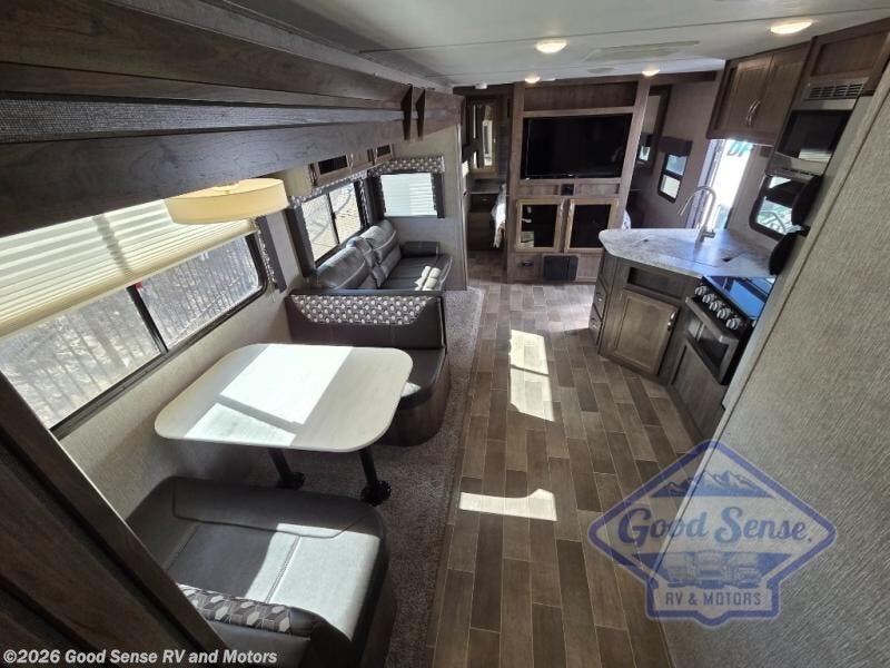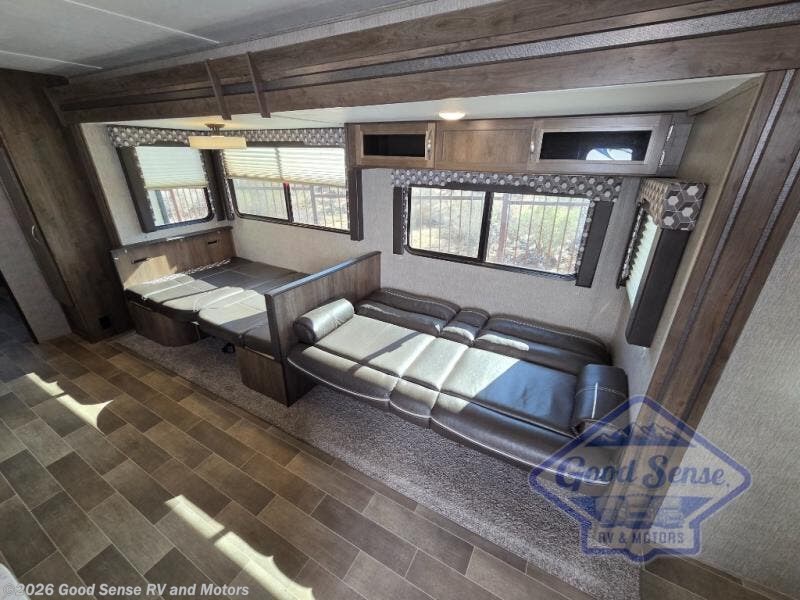 This travel trailer with double slides has all the features you will want as you camp away from home. The outside kitchen is perfect for cooking and enjoying breakfast outdoors before your day. Inside, you'll find a three burner range to whip up dinner. The kids will love having their own space in the bunkhouse that includes plenty of space for them to move around or play on the floor. This unit features a front bedroom with a queen bed and curtains for a little extra privacy. The full bathroom includes a second entry into the trailer for an added convenience when having fun outdoors.