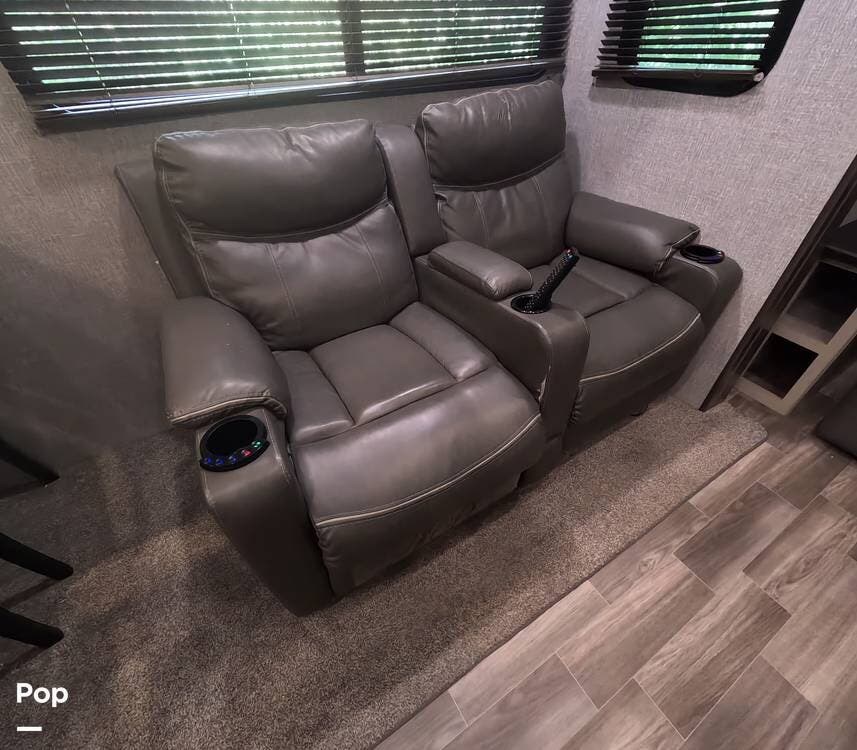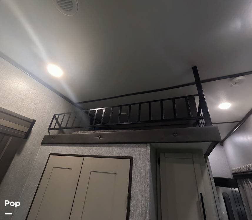 With its deluxe closet, king bed slide-out, and a room ready to add a washer and dryer if desired, the front private bedroom will make you feel at home. The 375DBL features two loft spaces for visitors or children, with a large bunk mat located above the bathroom and two additional bunk mats above the bedroom. Enjoy lounging on the theater seats or sofa in the back living area while streaming shows on the 50" TV to end your day.