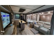 Step inside, and a well-appointed and thoughtfully designed interior will greet you. The living area is spacious and inviting, featuring comfortable residential-style furnishings. Plush sofa and recliners provide ample seating for relaxation, and the entertainment center offers a TV and a fireplace for cozy nights in.